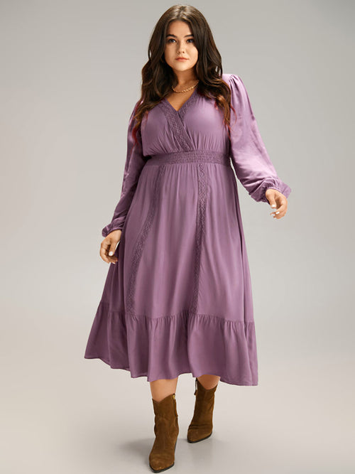 Solid Eyelet Lace Shirred Wrap Flutter Hem Dress