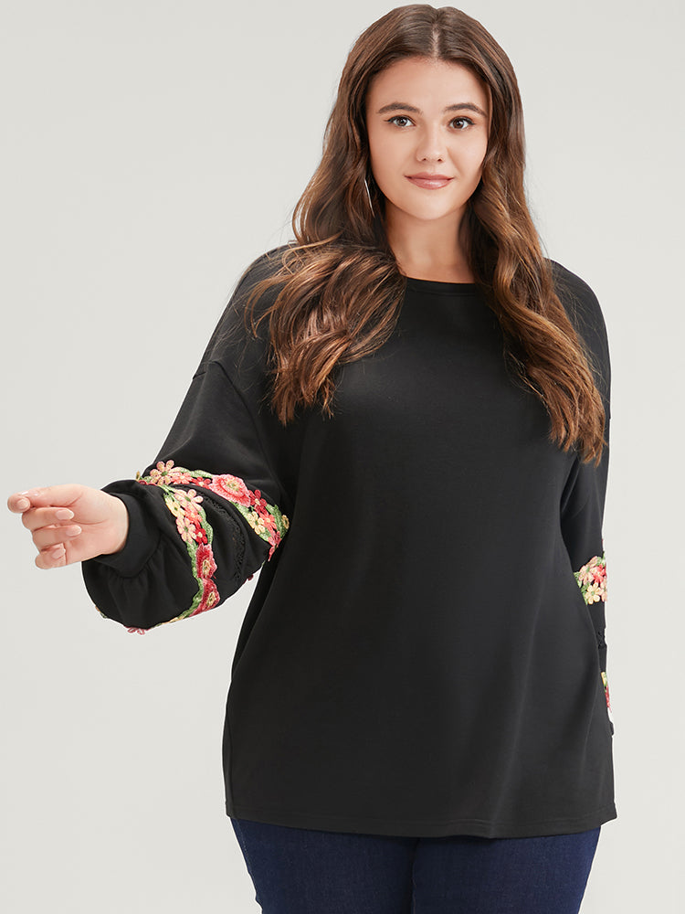 Solid Floral Embroidered Contrast Lace Sweatshirt
