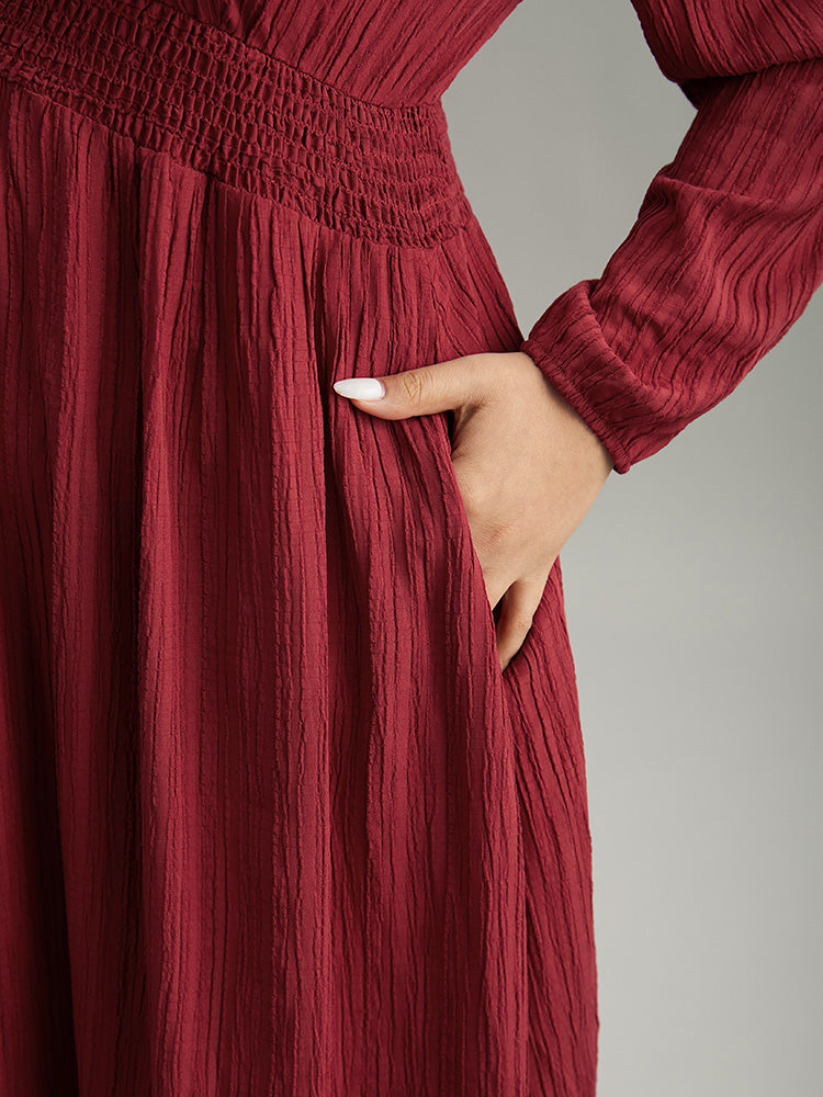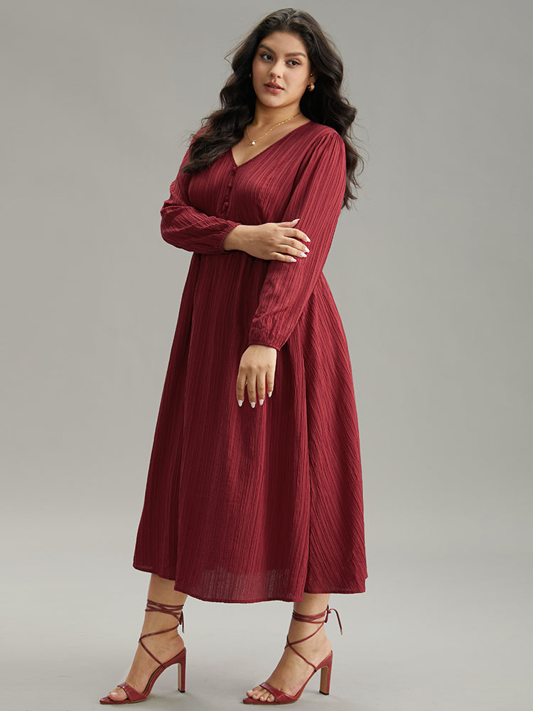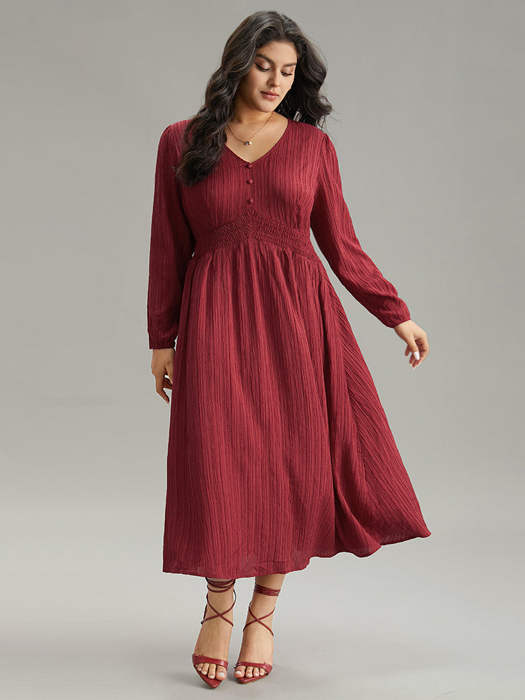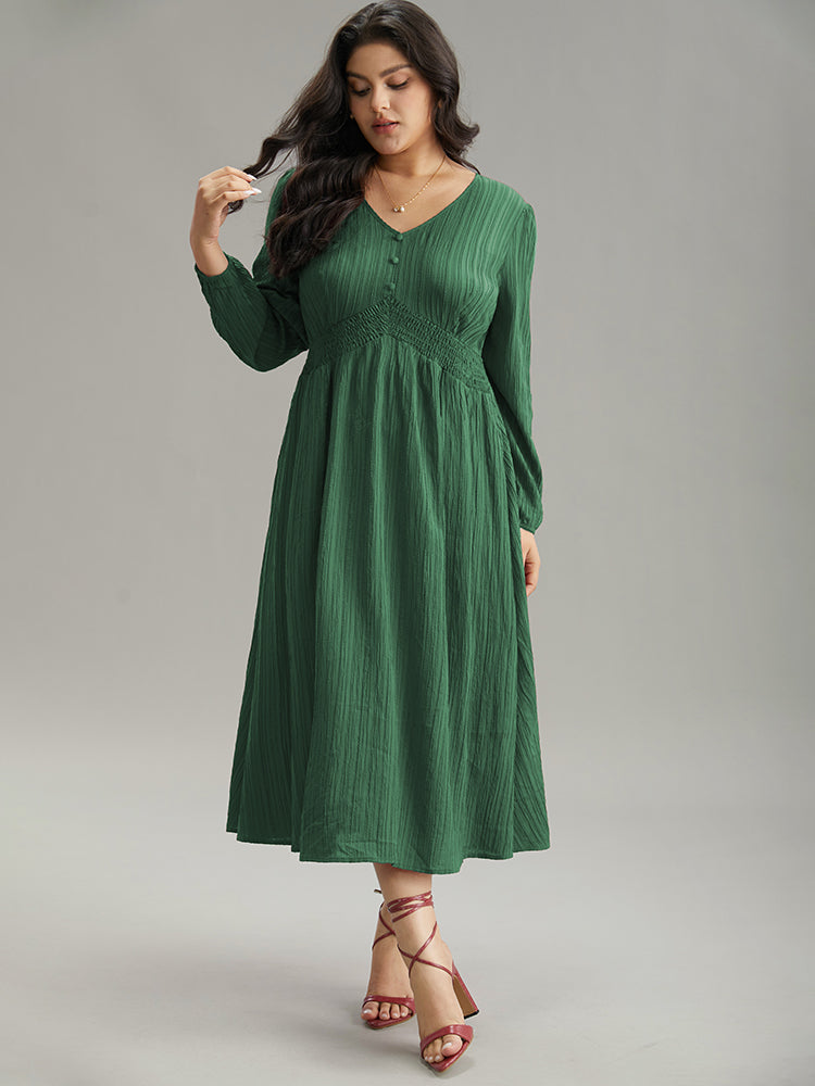 Solid Plisse Button Detail Shirred Dress