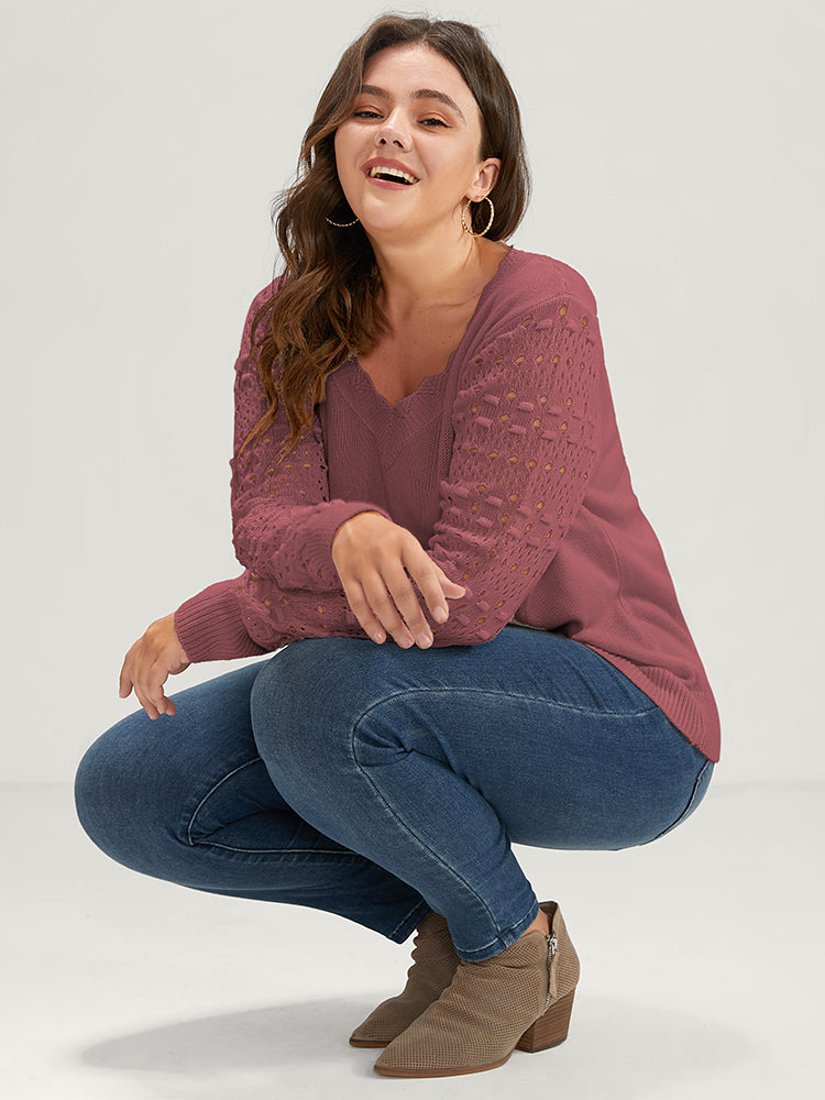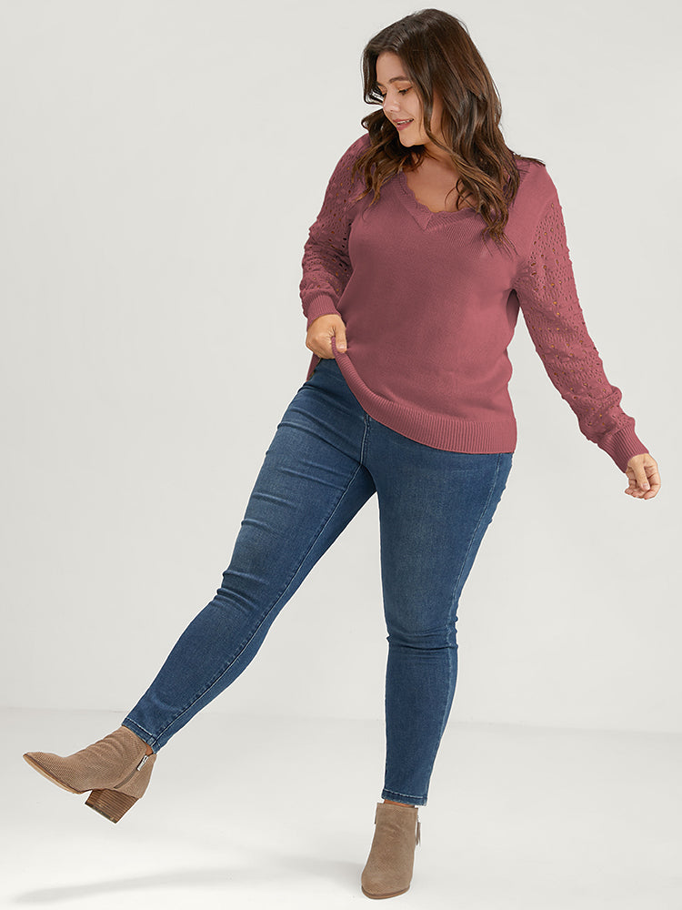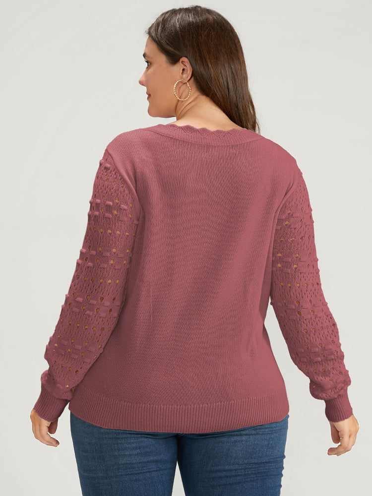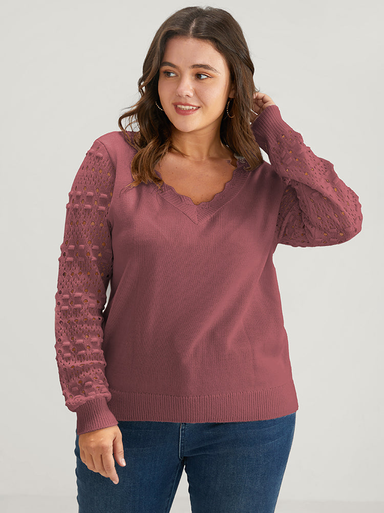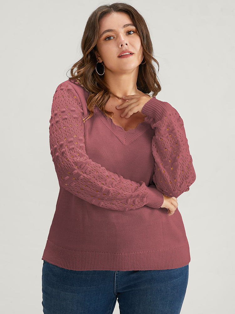 Solid Pointelle Knit Scalloped Trim V Neck Crochet Knit Top