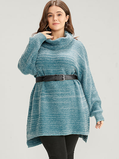 Solid Pointelle Knit Split Hem Funnel Neck Fluffy Knit Top