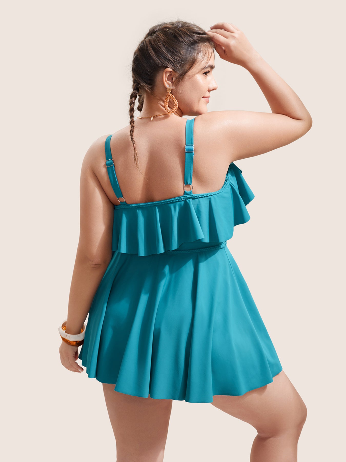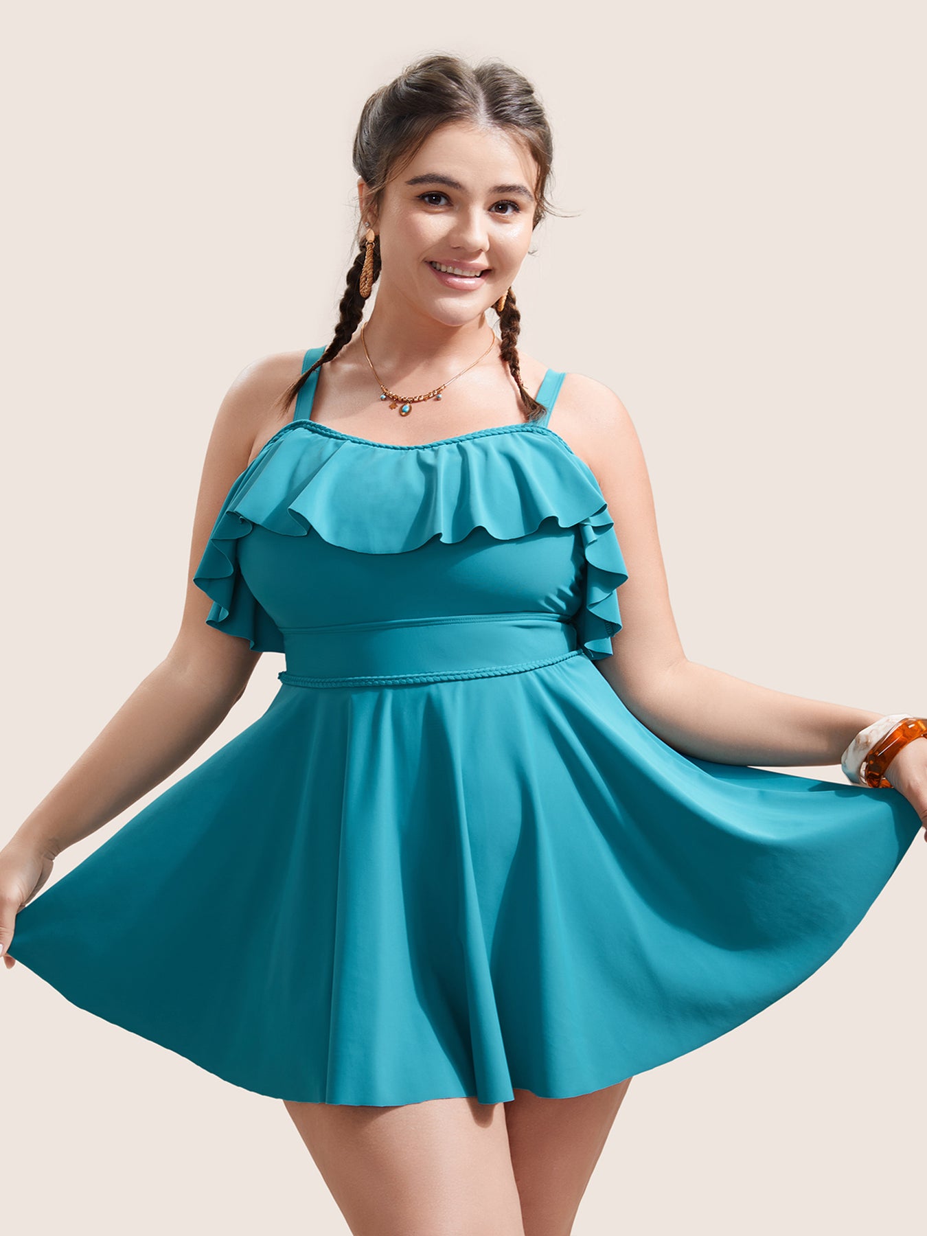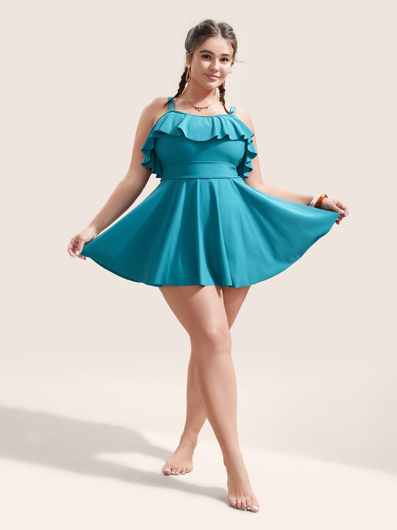 Solid Ruffles Trim Adjustable Straps Swim Dress