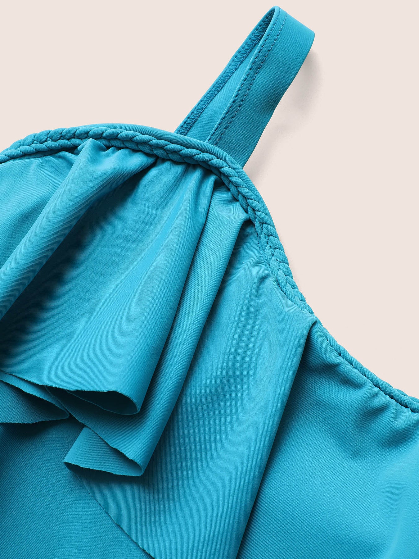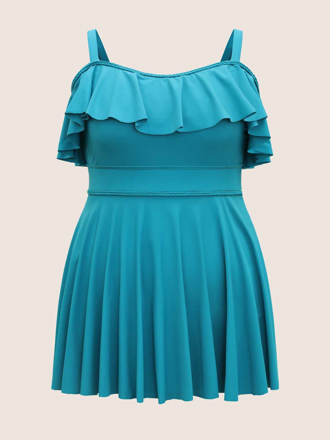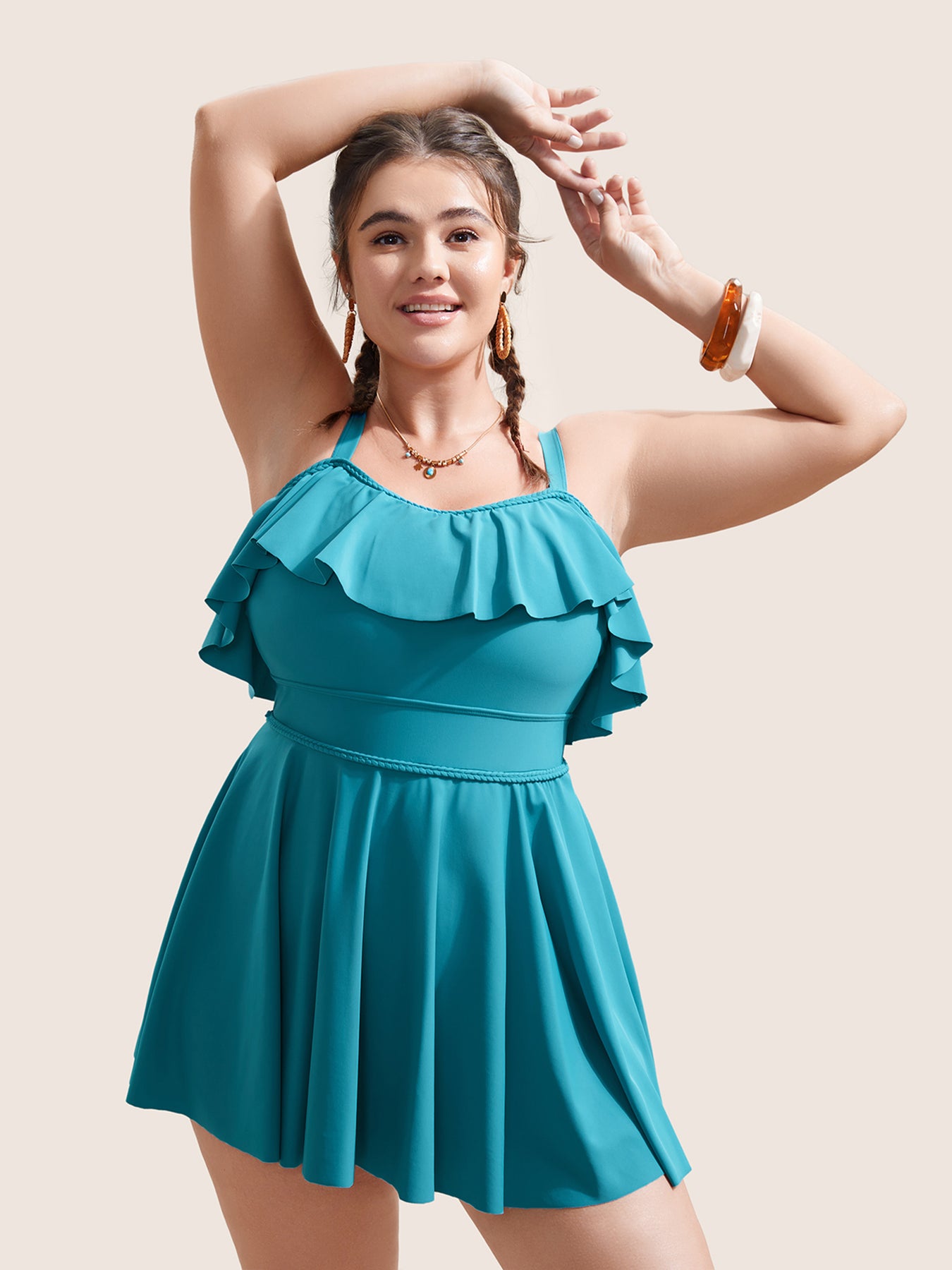Solid Ruffles Trim Adjustable Straps Swim Dress