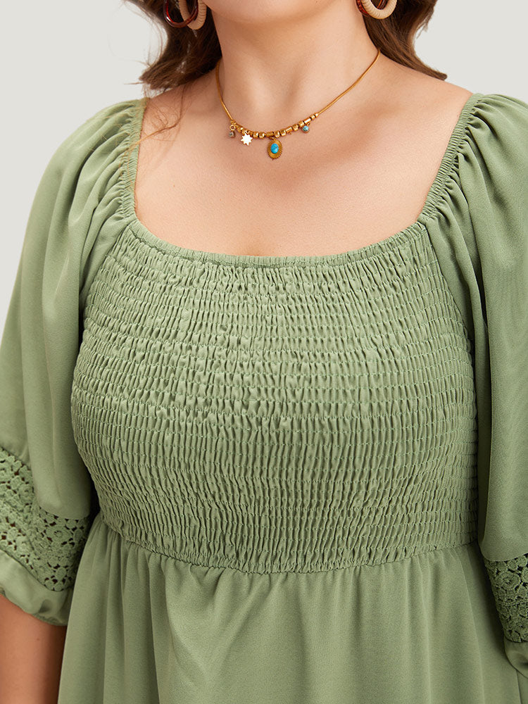 Solid Shirred Square Neck Guipure Lace Dress