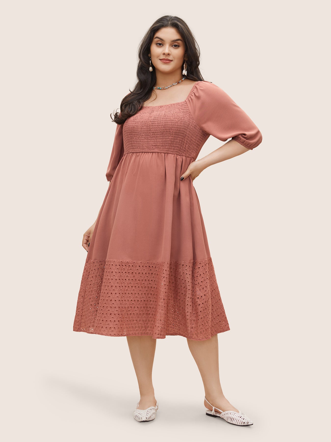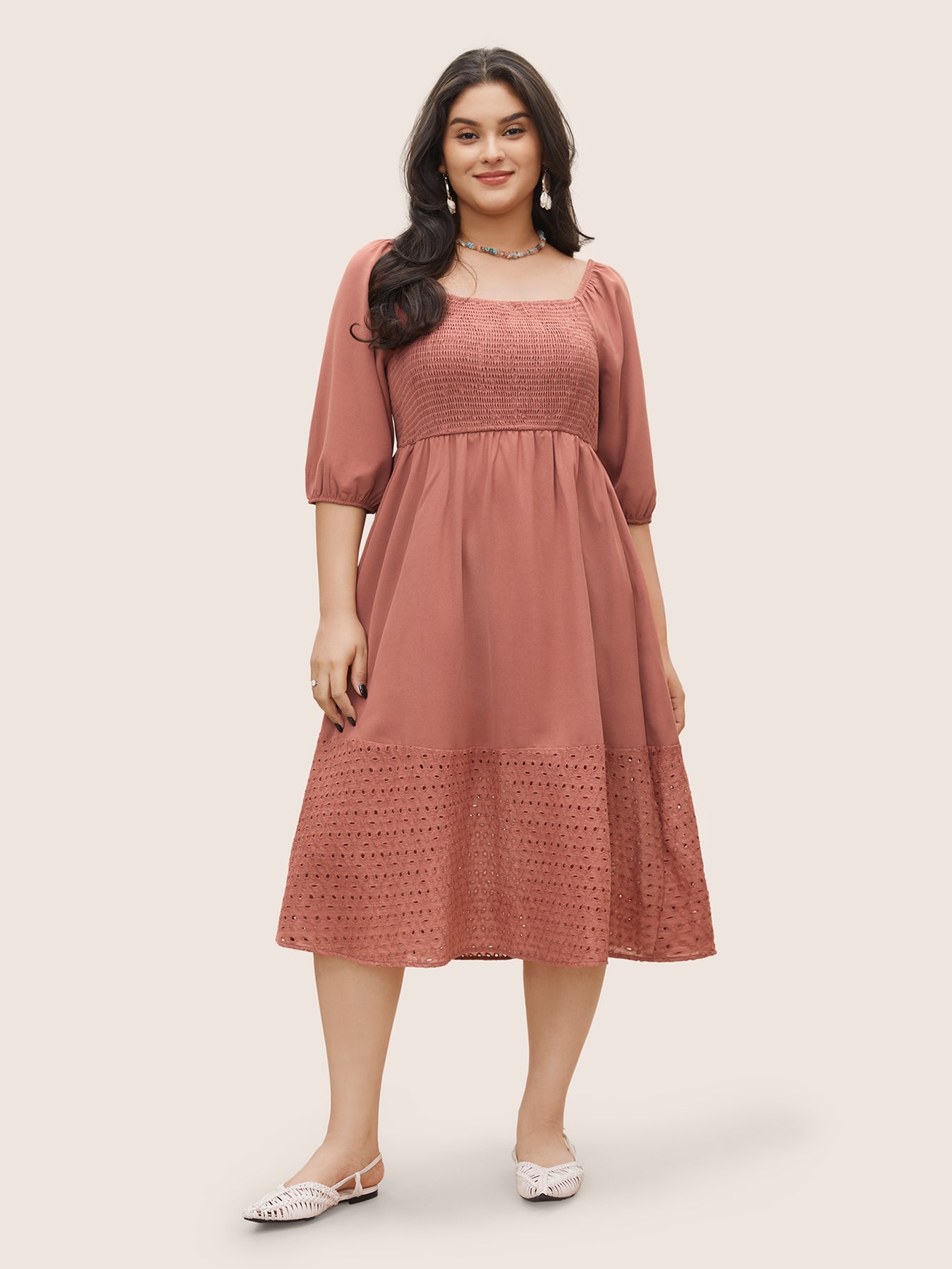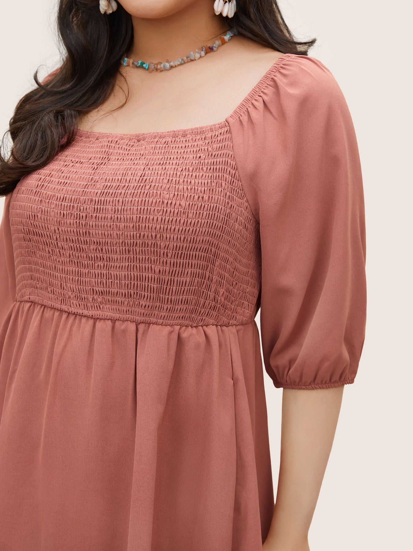 Solid Square Neck Shirred Elastic Waist Cut Out Dress