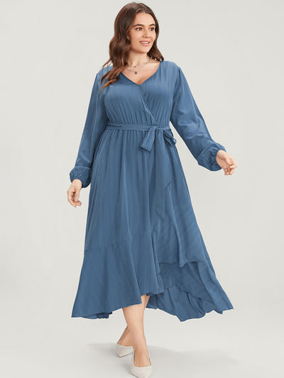Solid Surplice Neck Lantern Sleeve Pocket Belted Asymmetrical Hem Dress