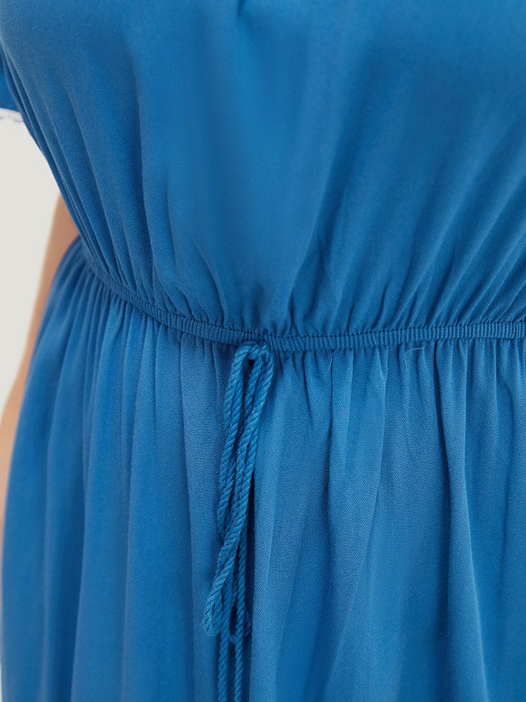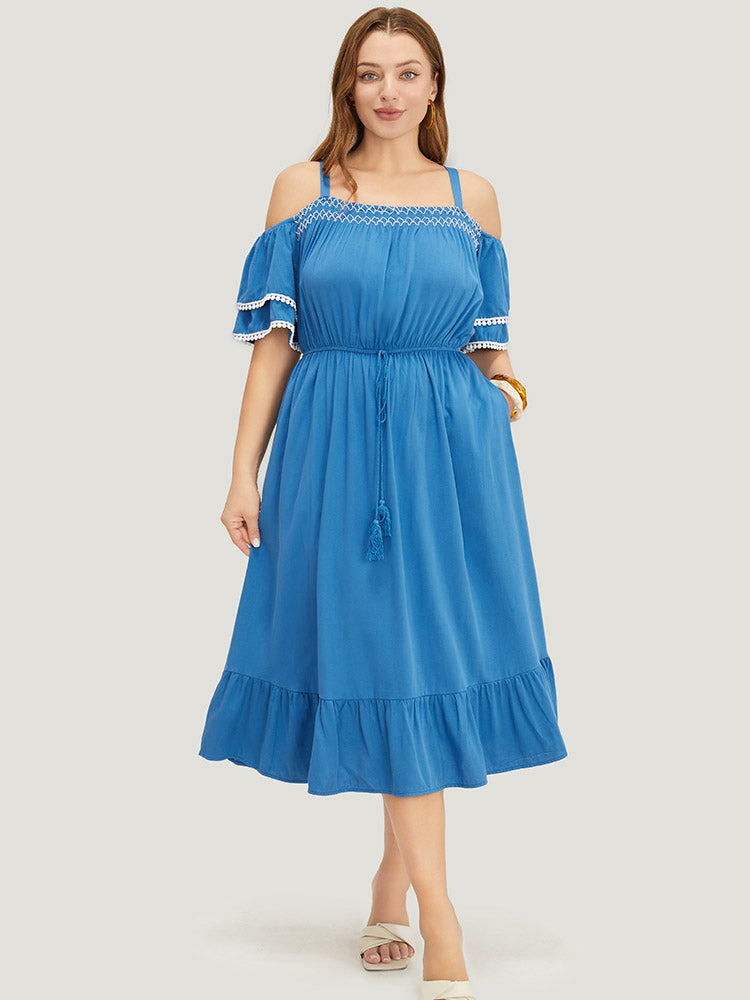 Solid Tiered Sleeve Pocket Ruffles Cold Shoulder Pompom Trim Dress