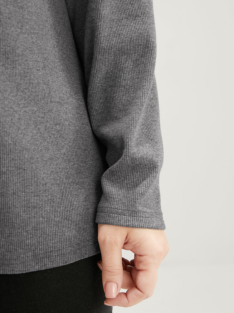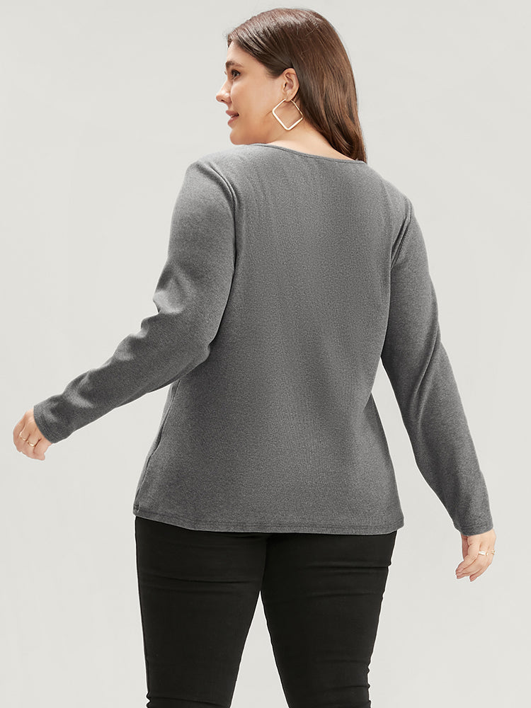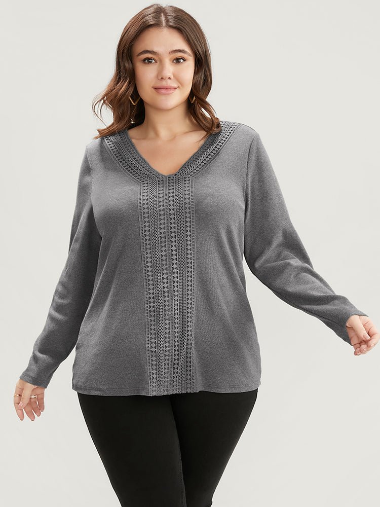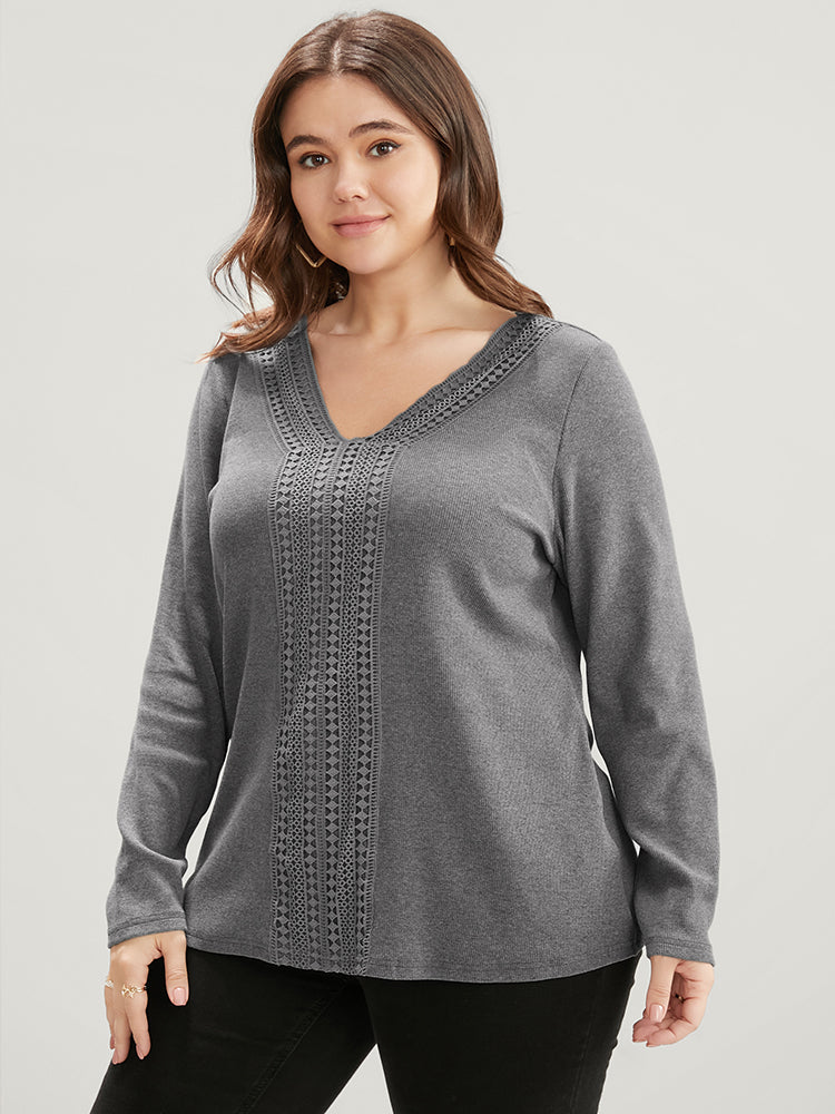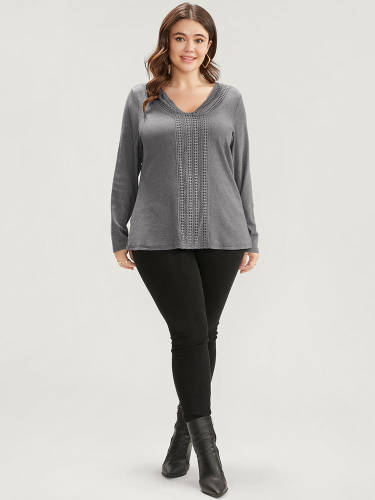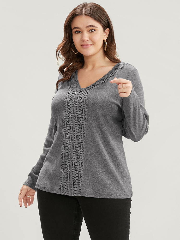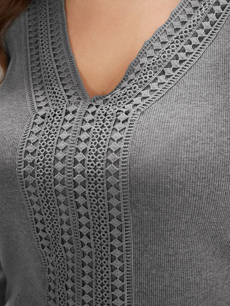Solid V Neck Crochet Lace Rib Knit Long Tee