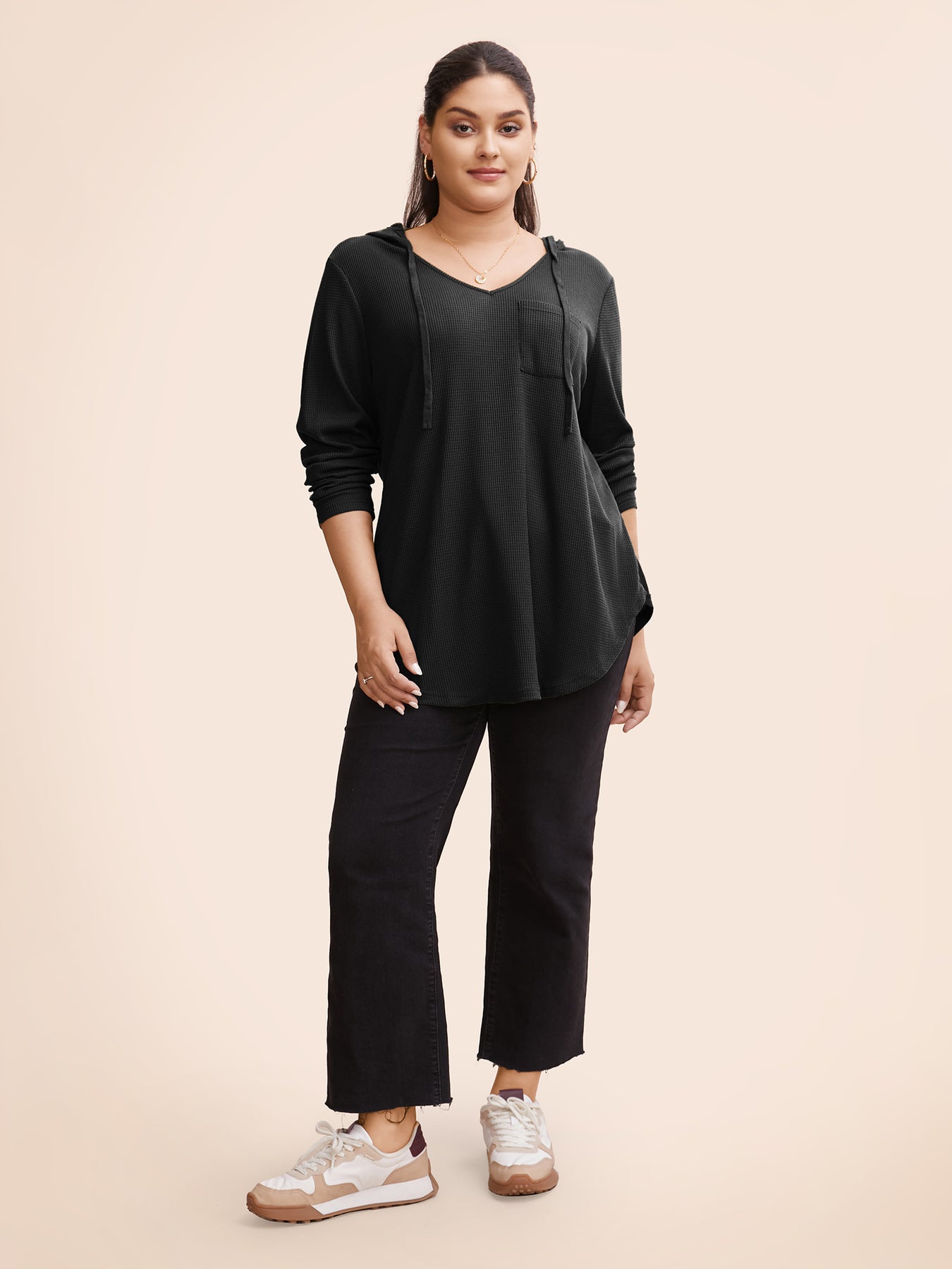 Waffle Knit Pocket Hooded Drawstring Arc Hem T-shirt