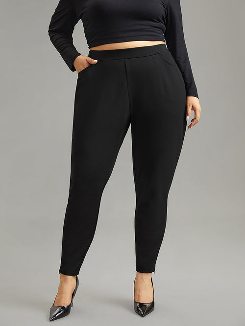 Solid Zipper Hem Elastic Waist Skinny Pants