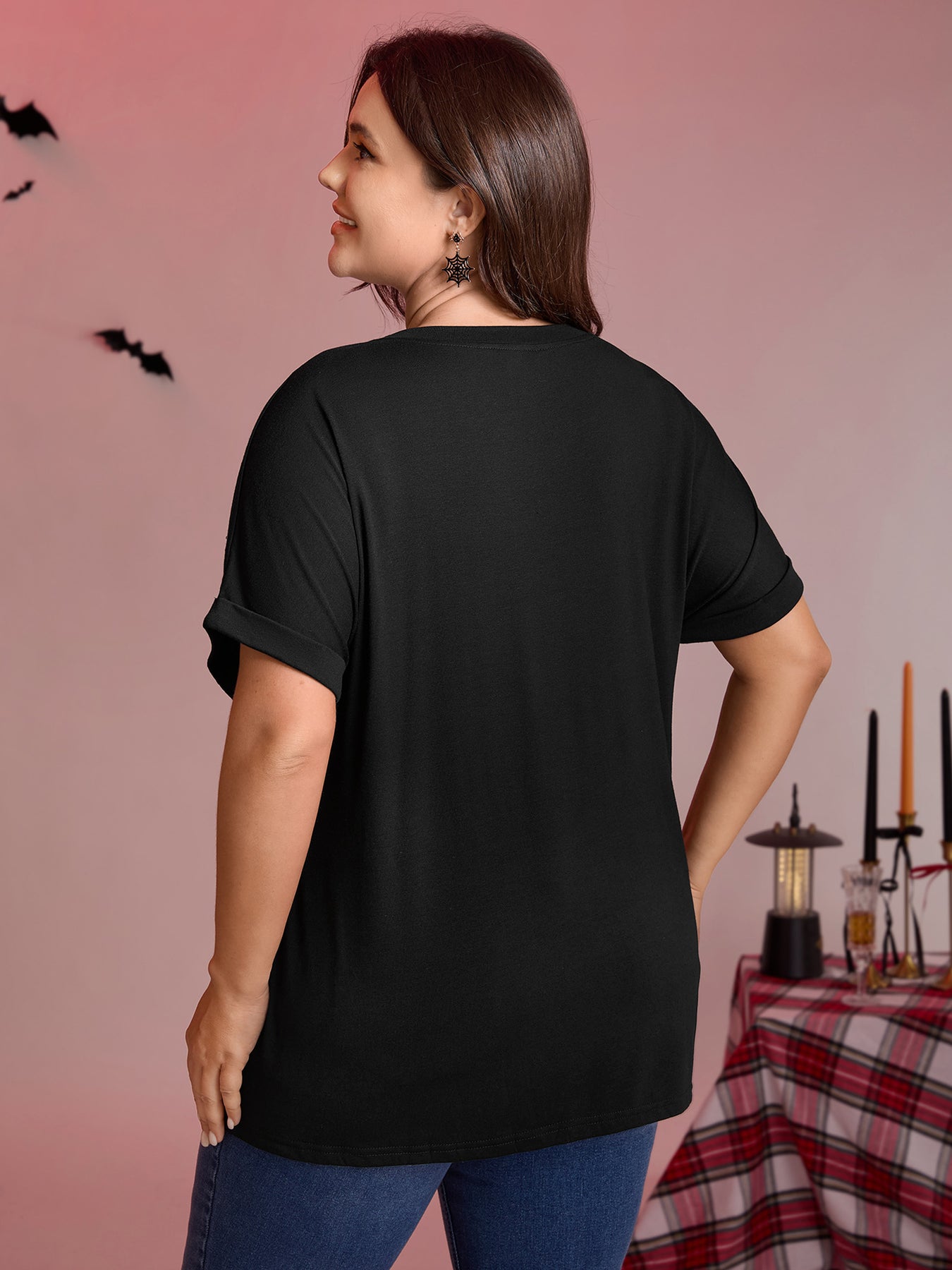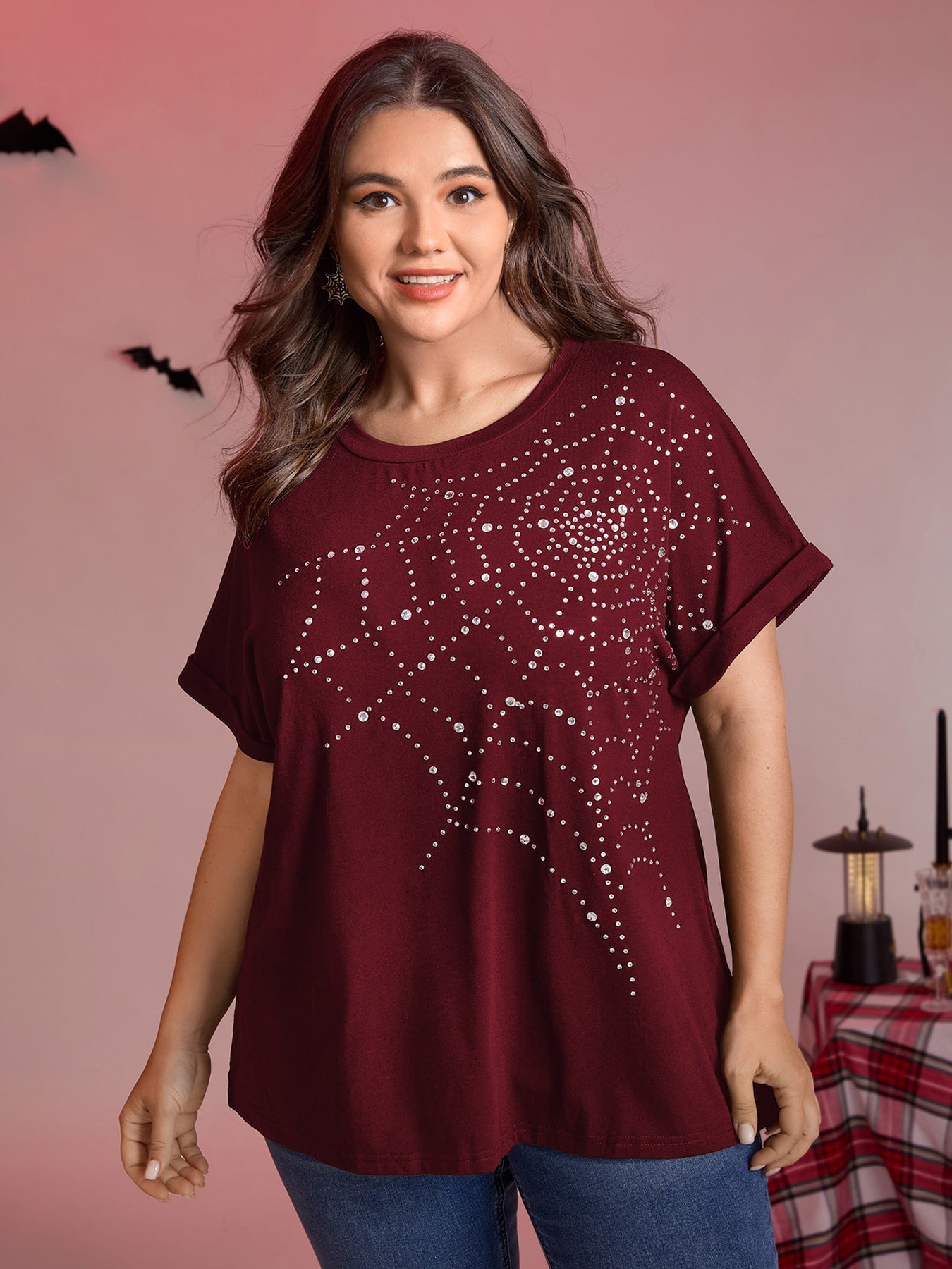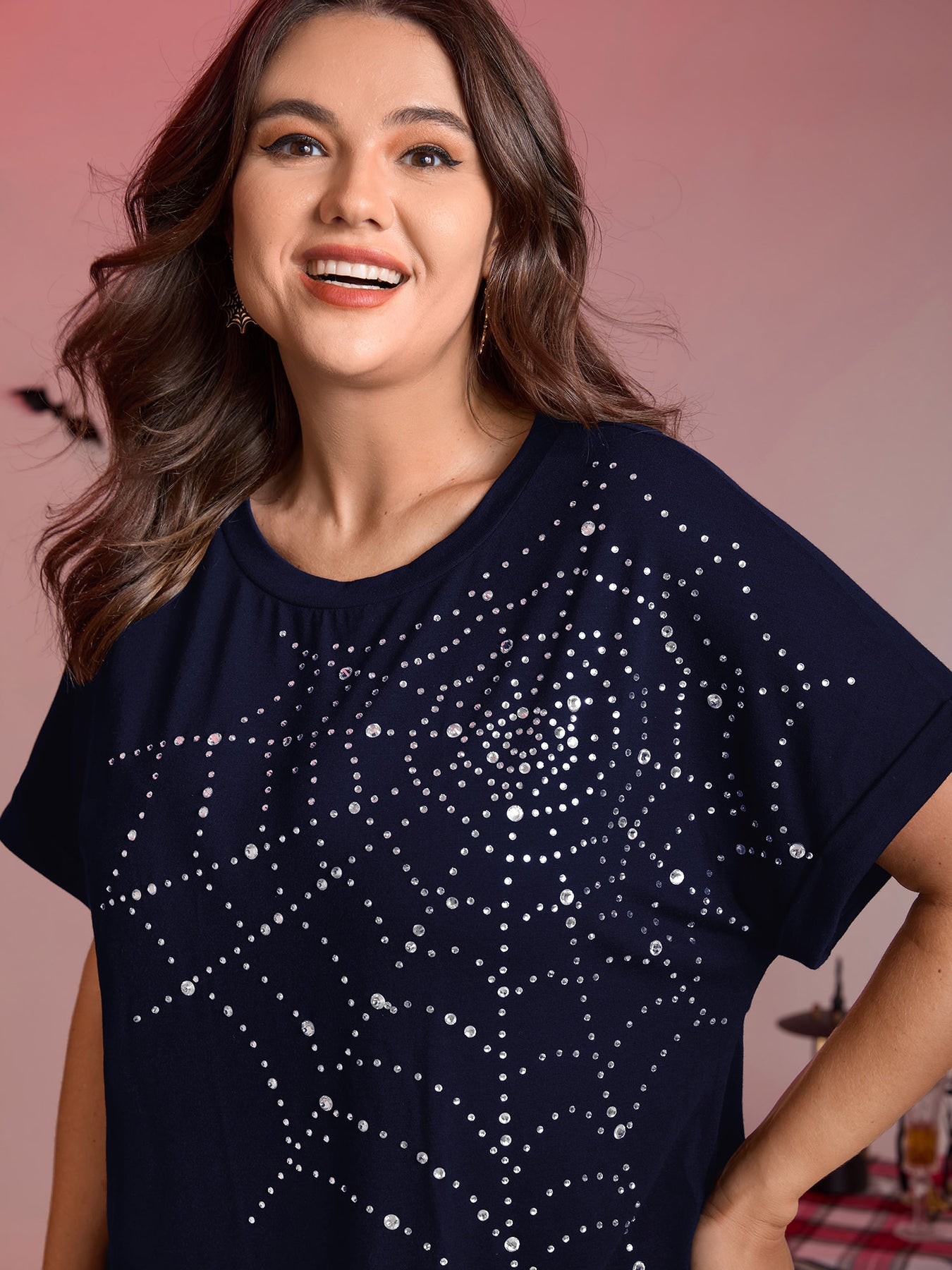 Spiderweb Rhinestone Stretchy Solid T-Shirt