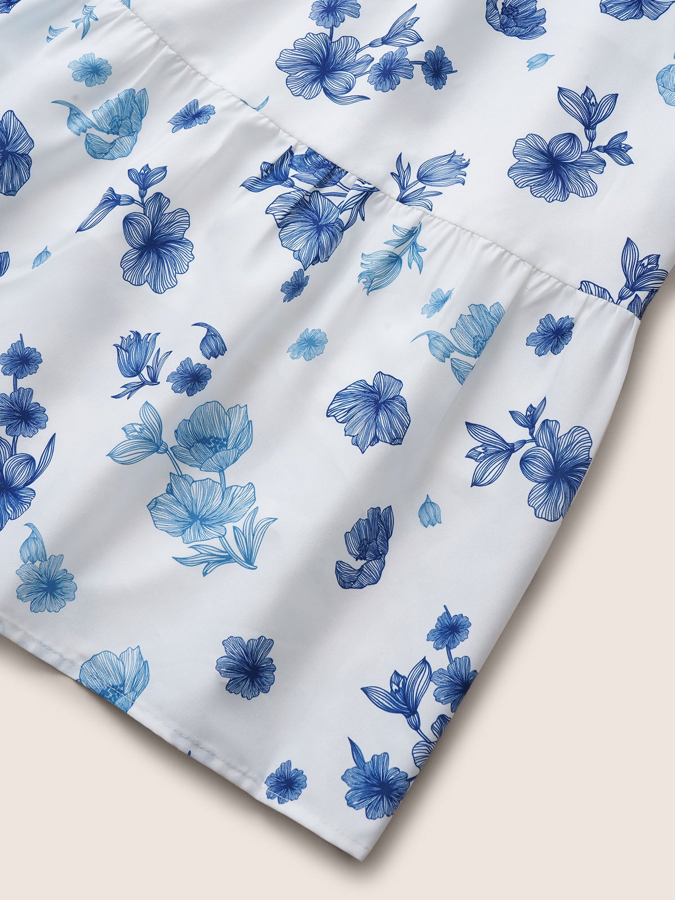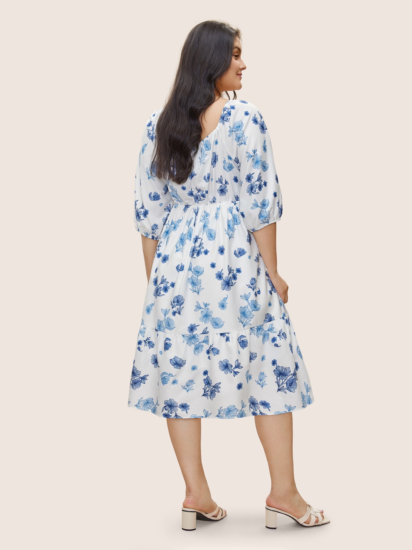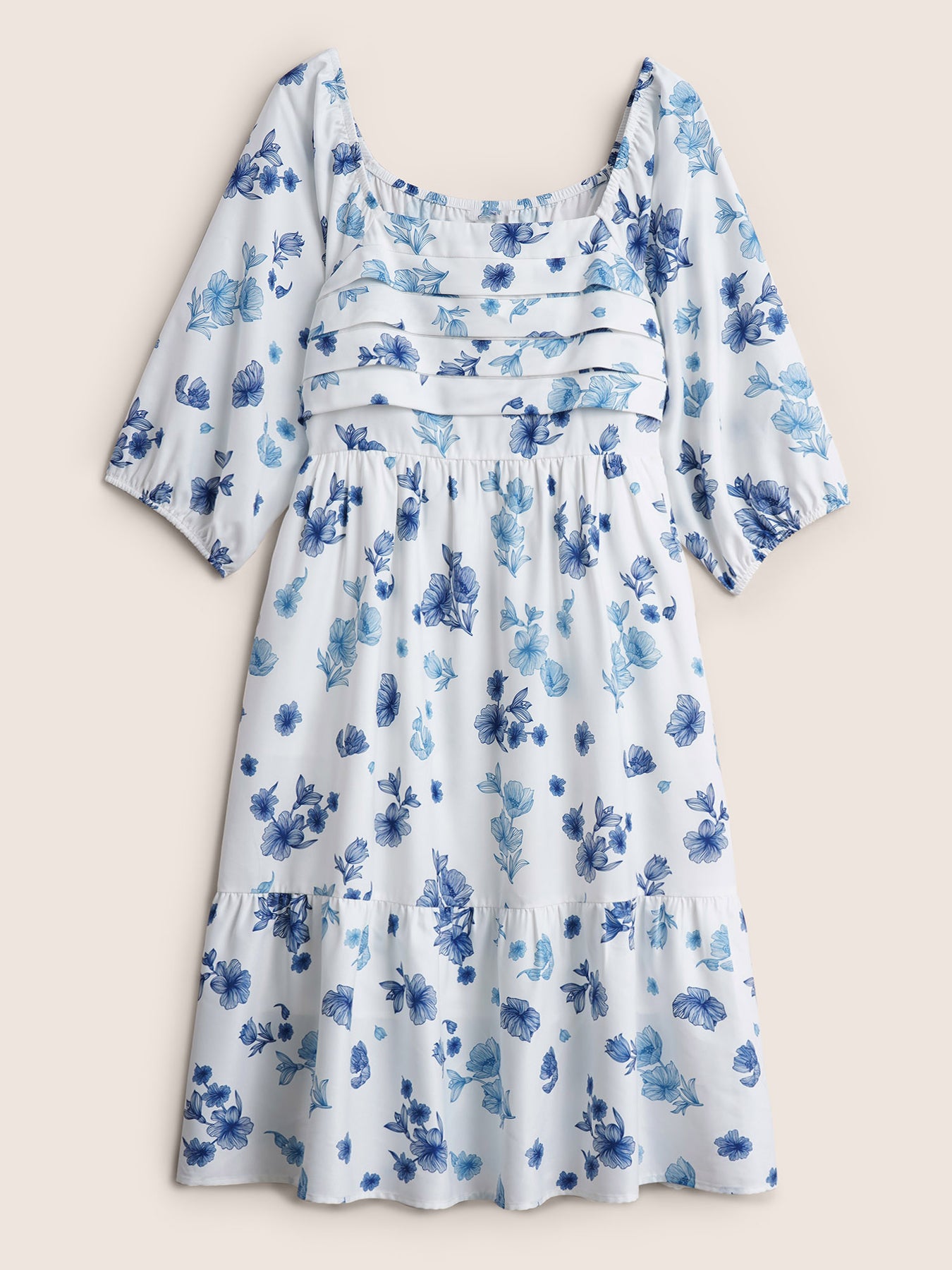 Square Neck Floral Print Pleated Lantern Sleeve Dress
