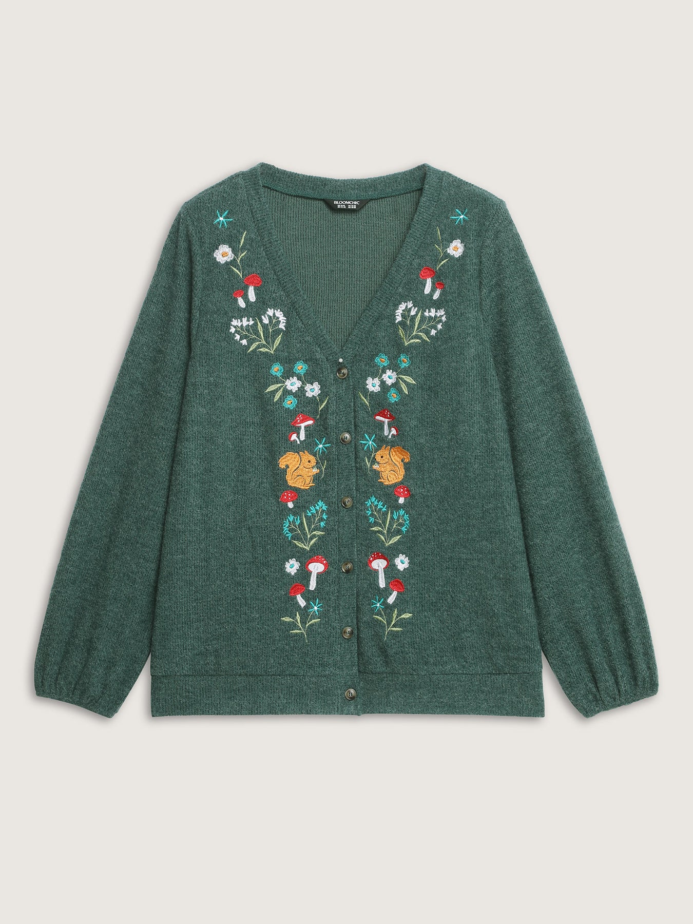 Squirrel Embroidered Button V-Neck Knit Cardigan