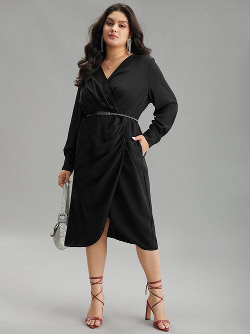 Static-Free Solid Plicated Detail Wrap Dress