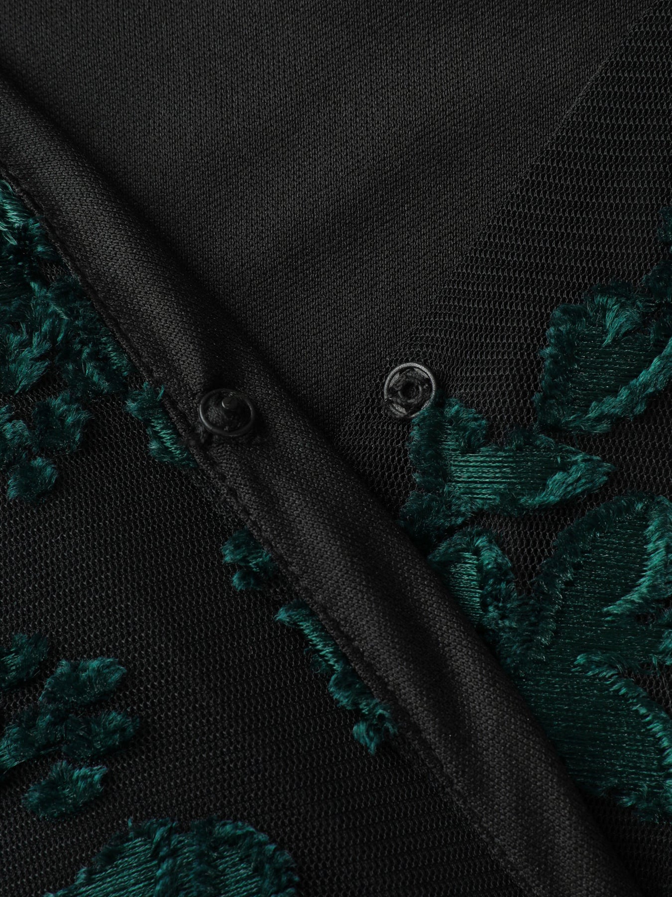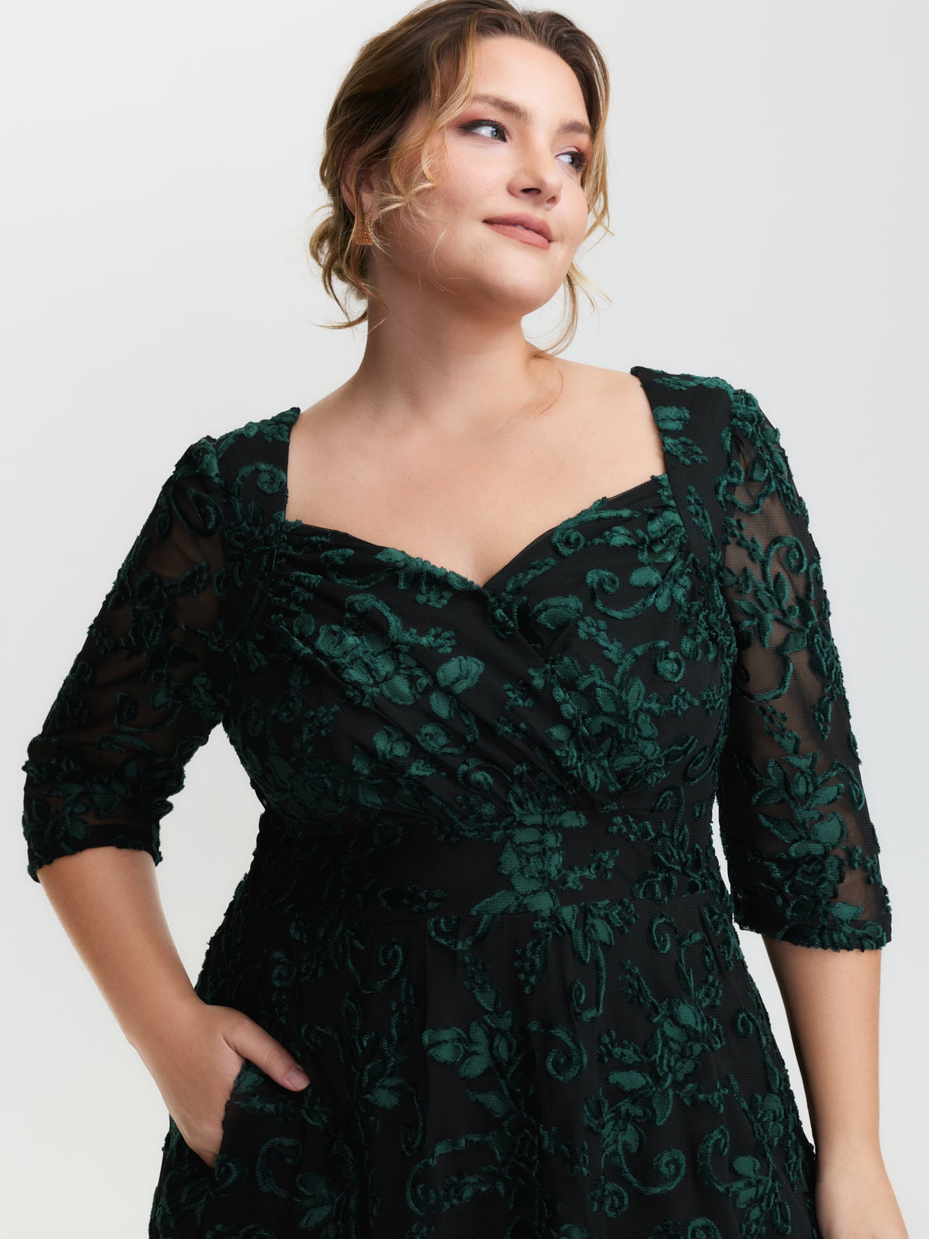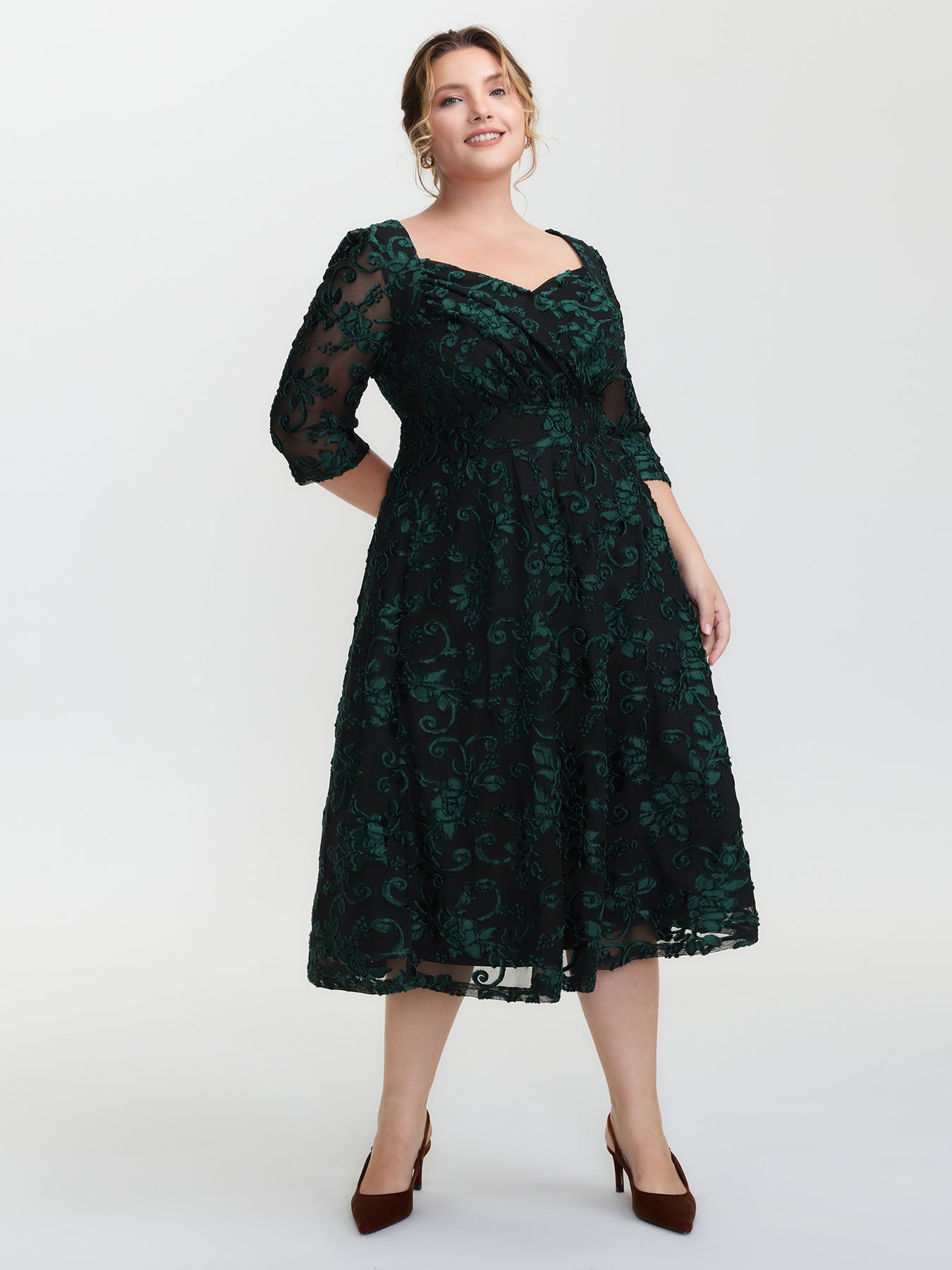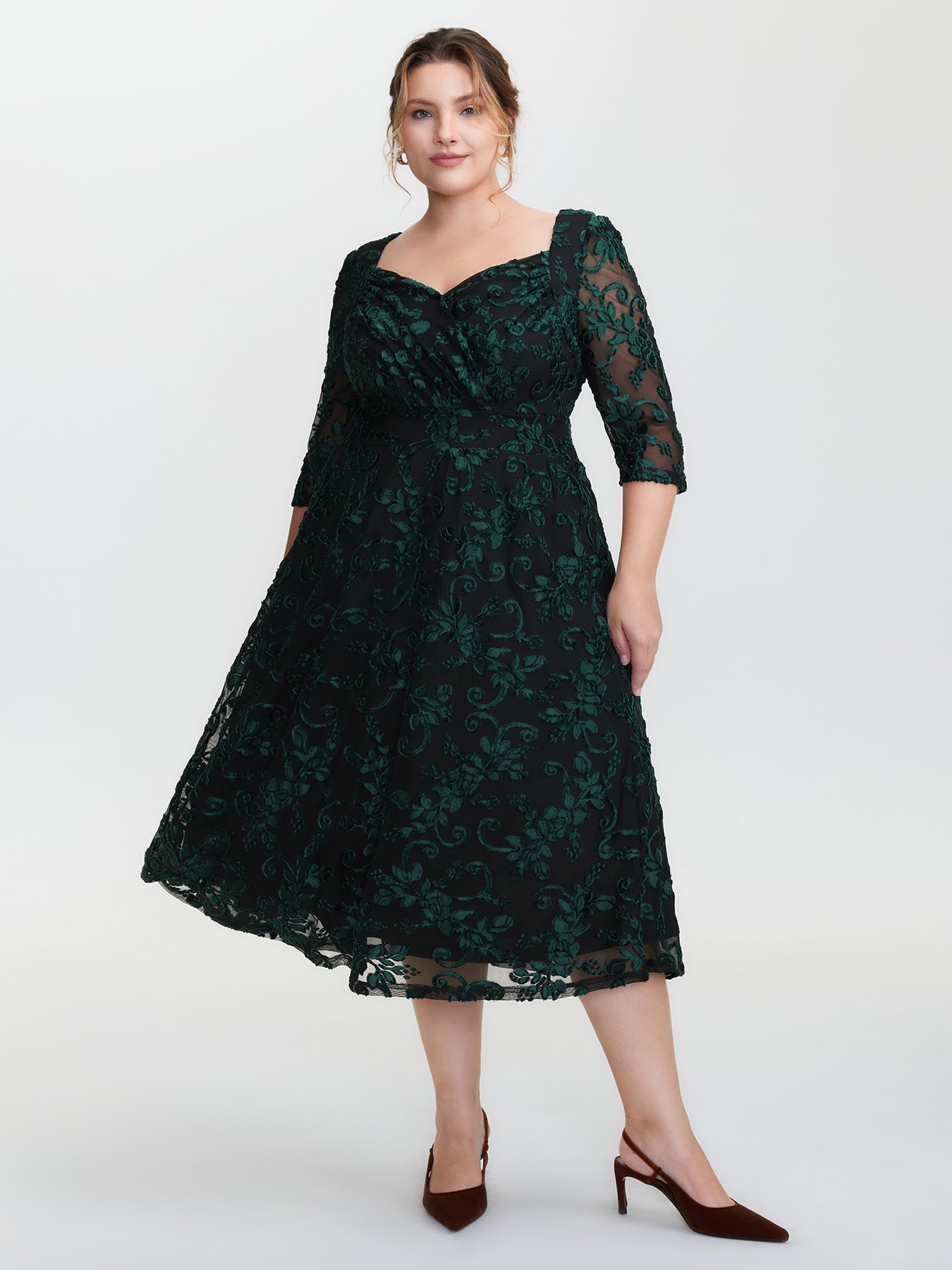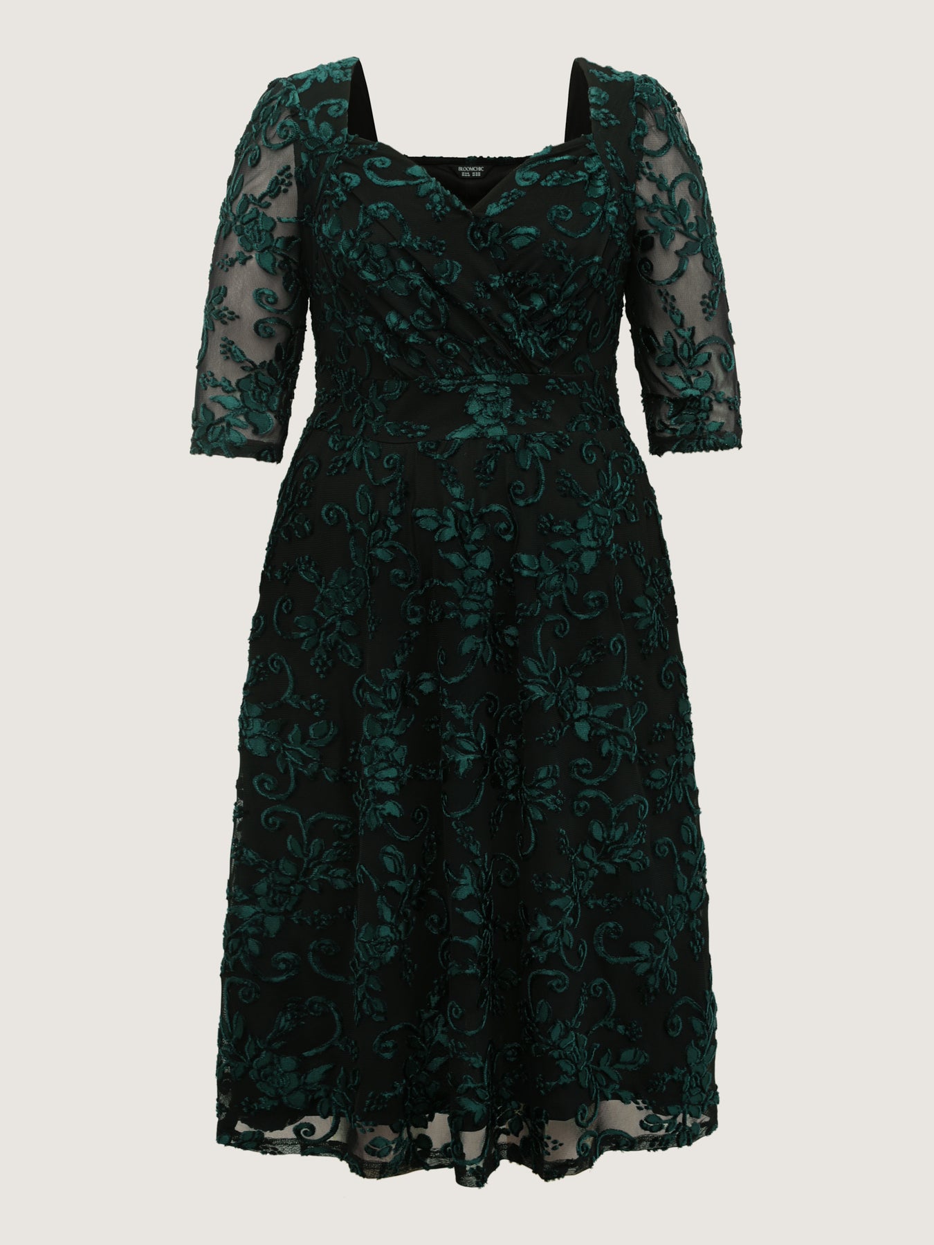 Stretchy Laser Cut Mesh Crossover Neckline Midi Dress