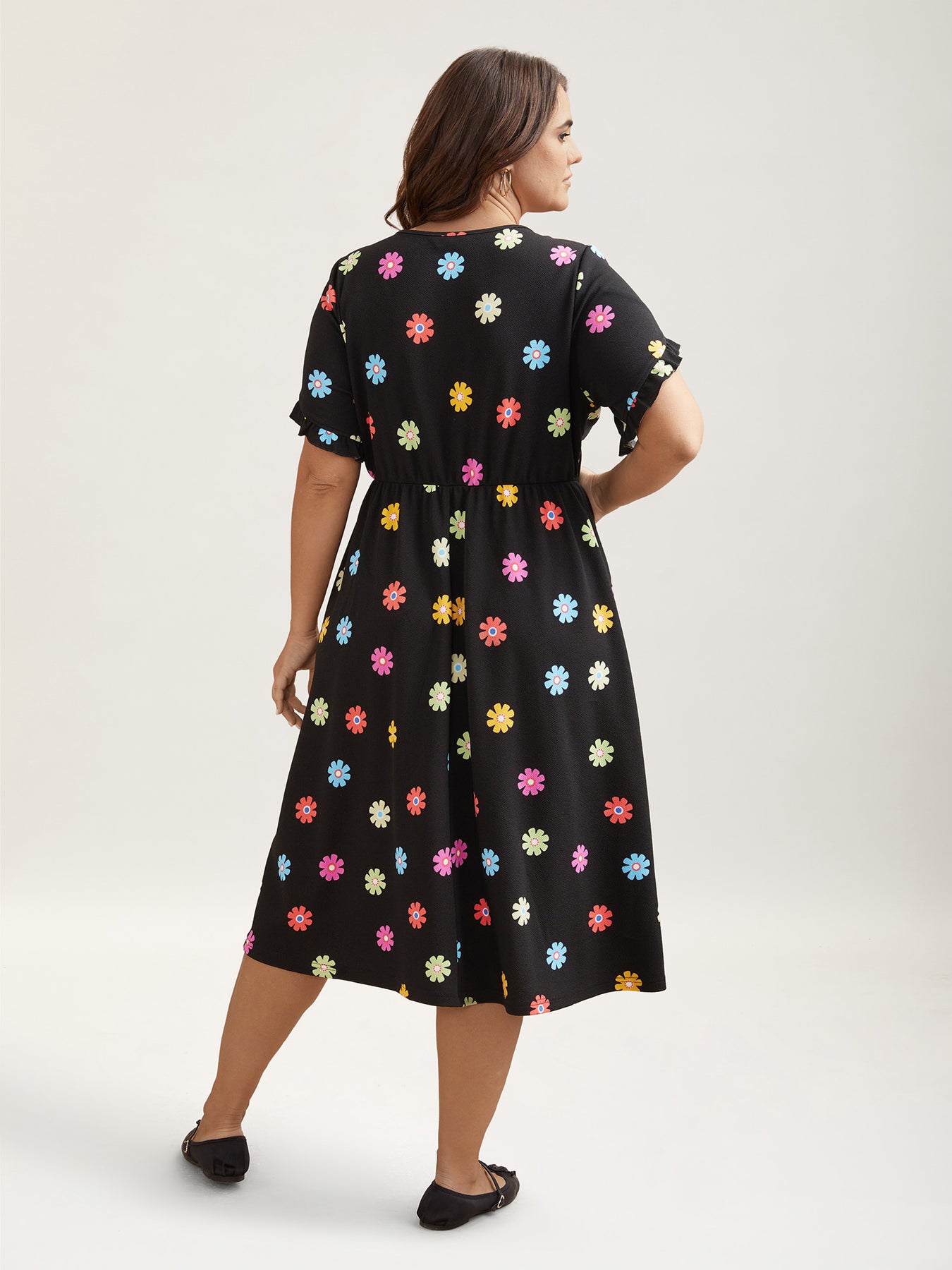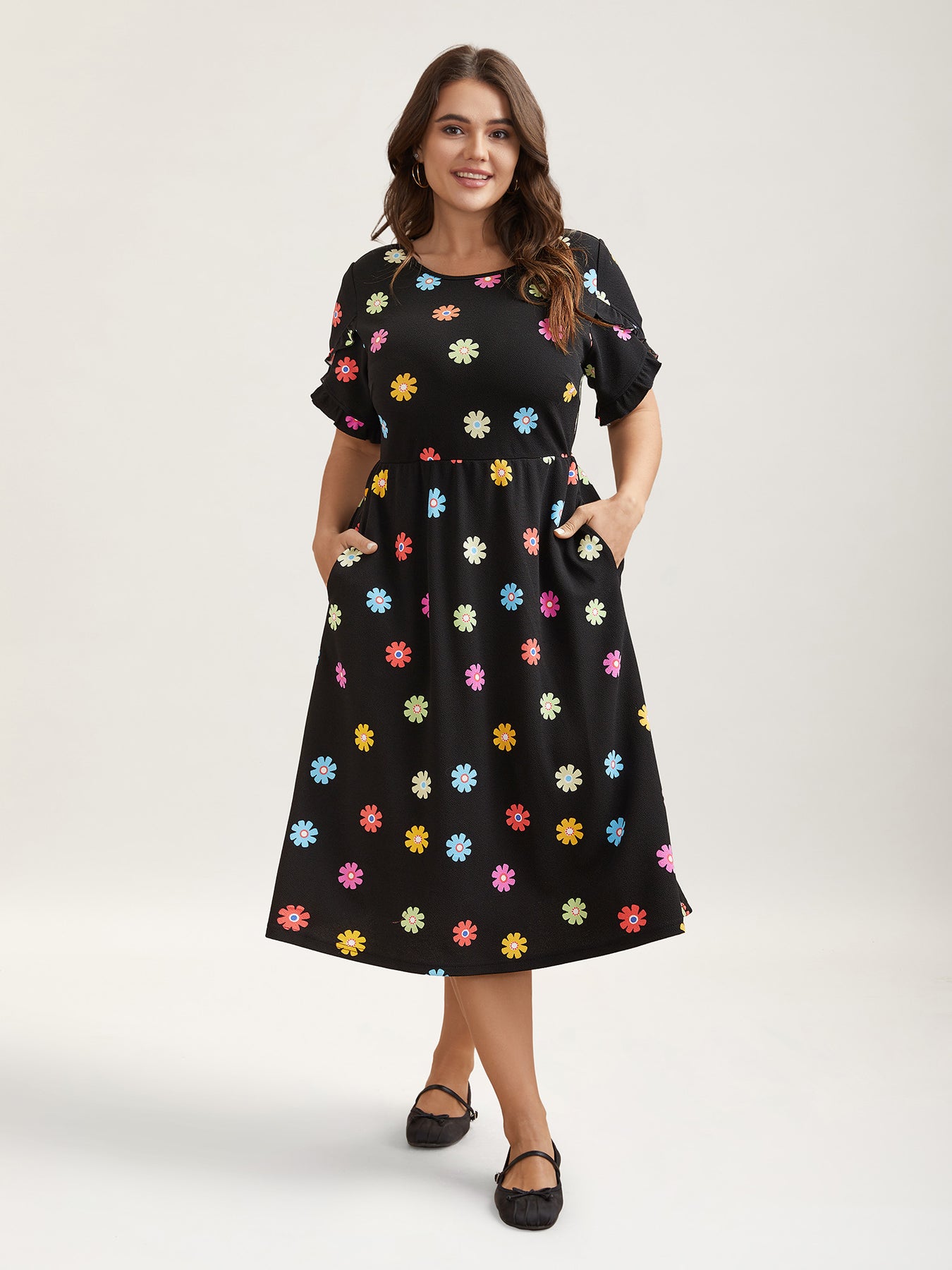 Stretchy-Waist Floral Print Pockets Midi Dress
