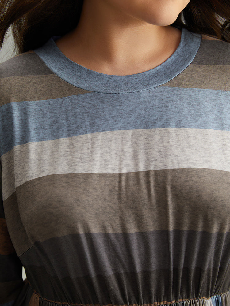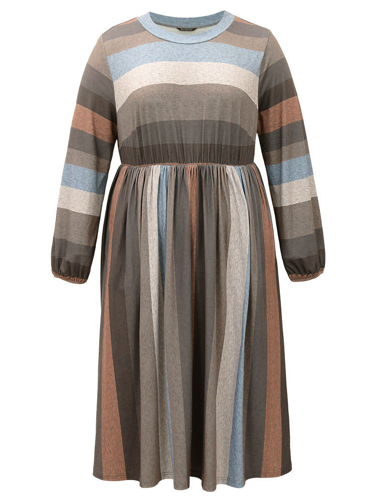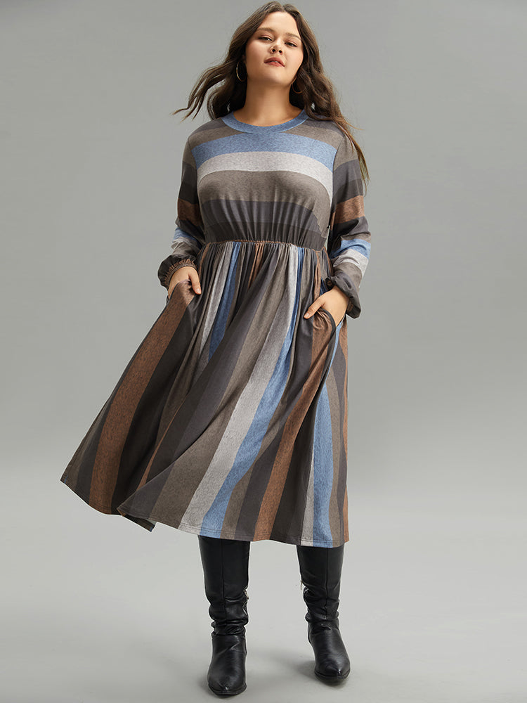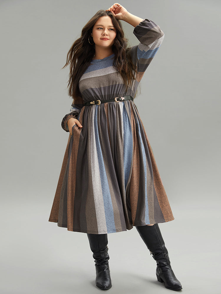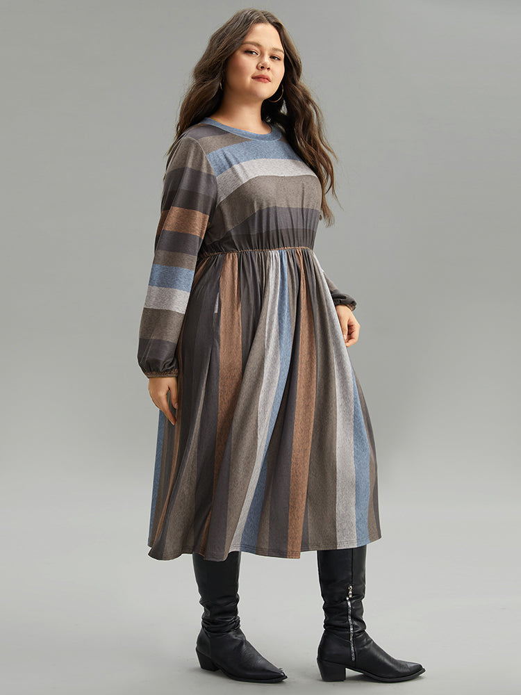 Striped Colorblock Contrast Lantern Sleeve Dress