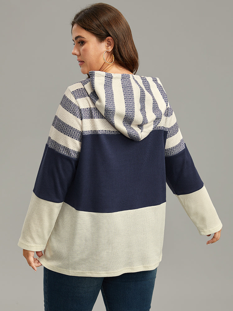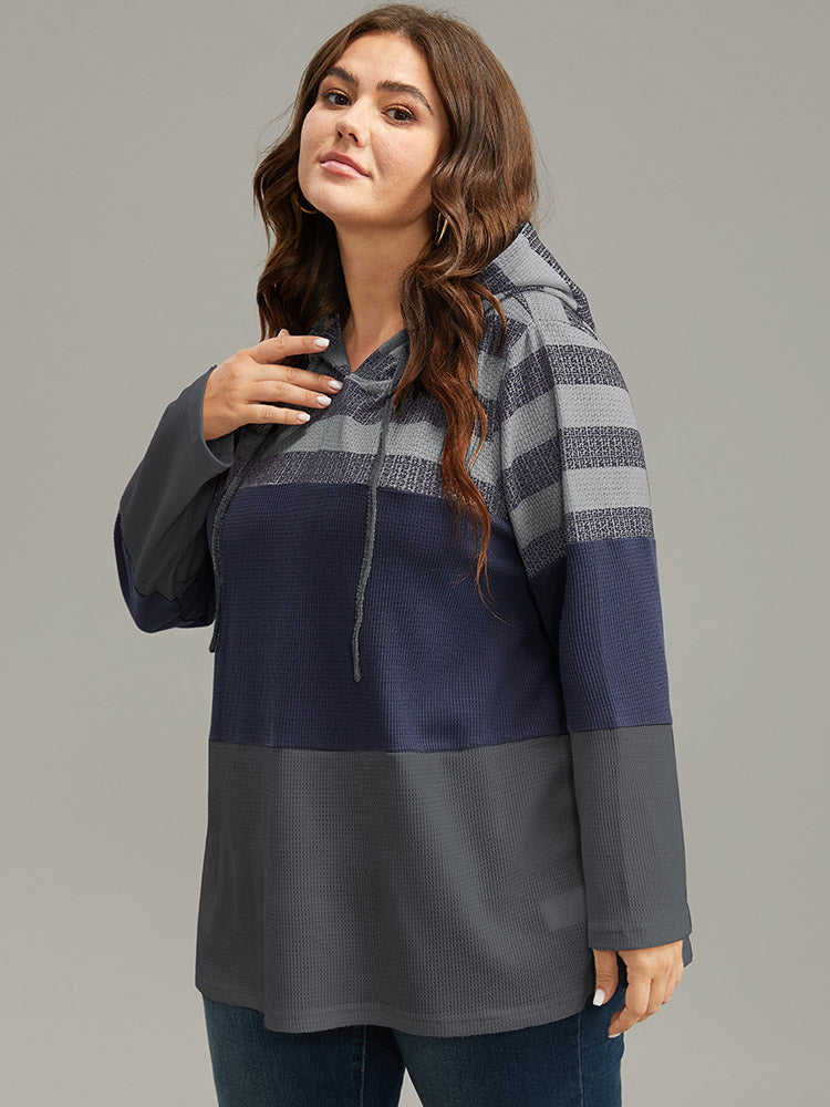 Waffle Knit Striped Colorblock Hooded Sweatshirt