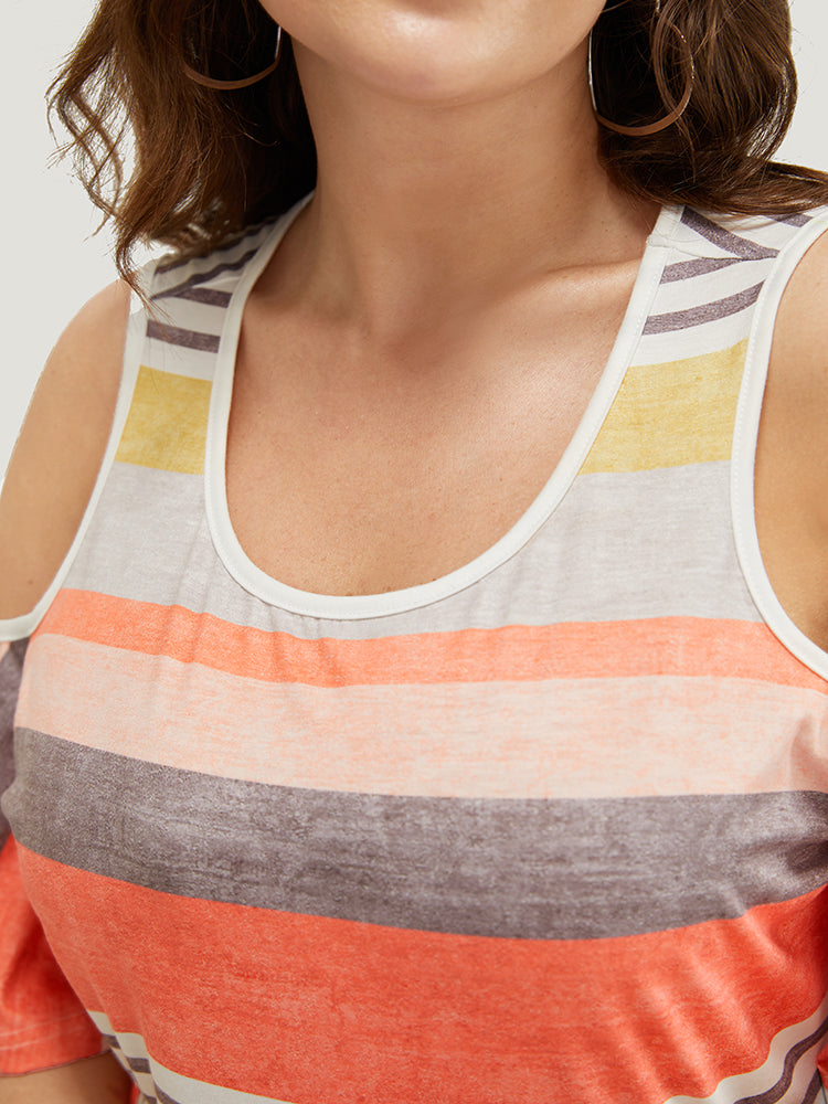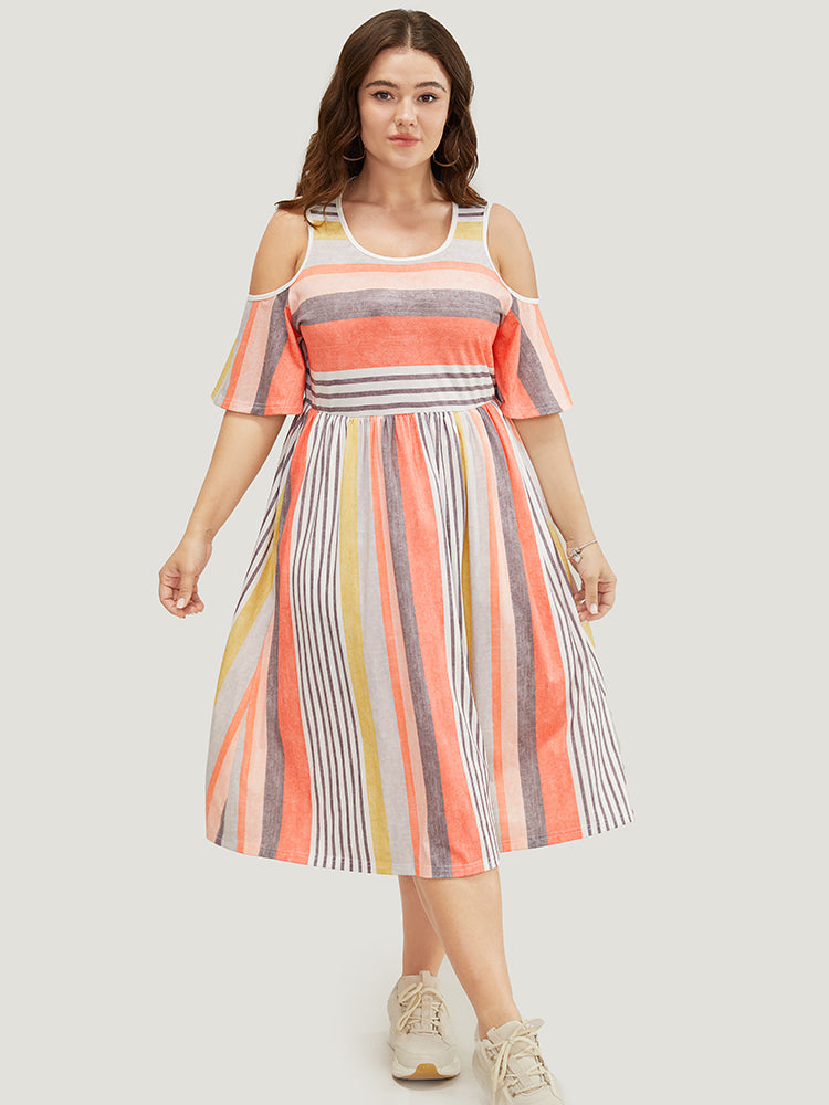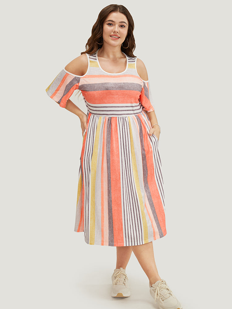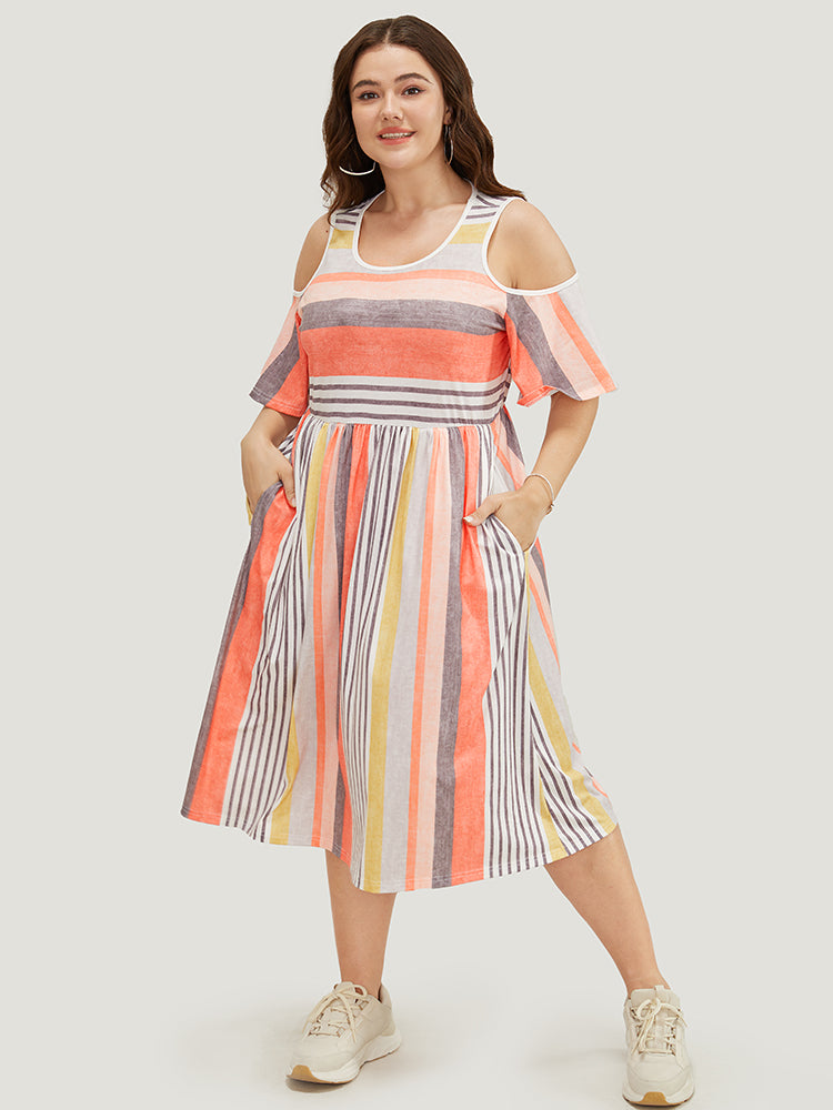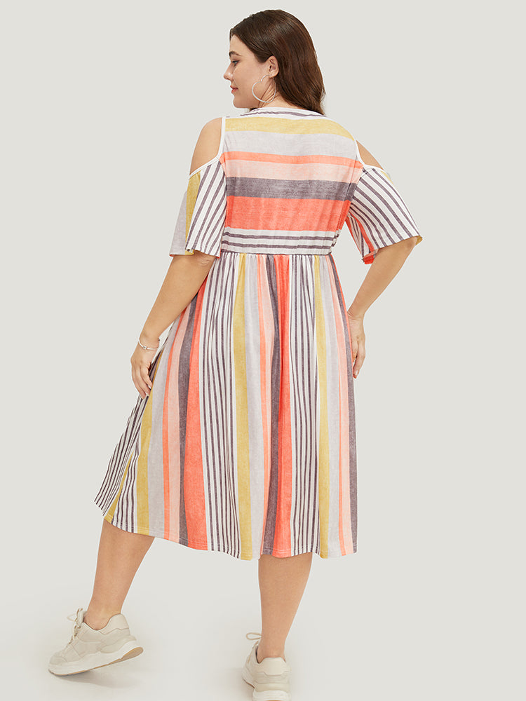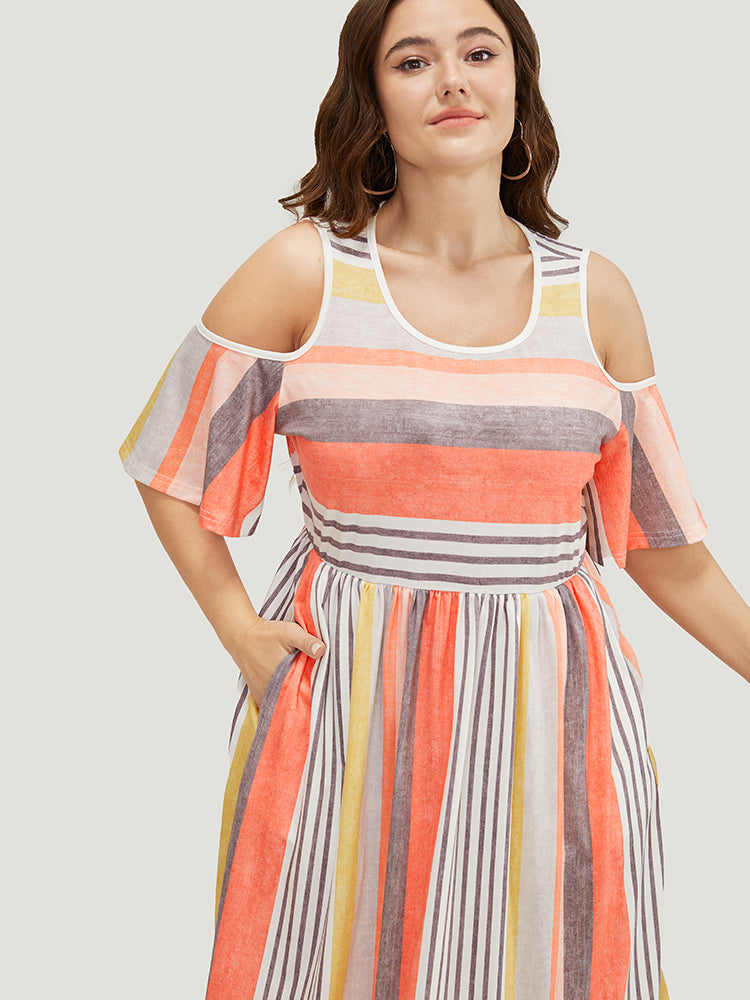 Striped Contrast Pocket Cold Shoulder Ruffle Midi Dress