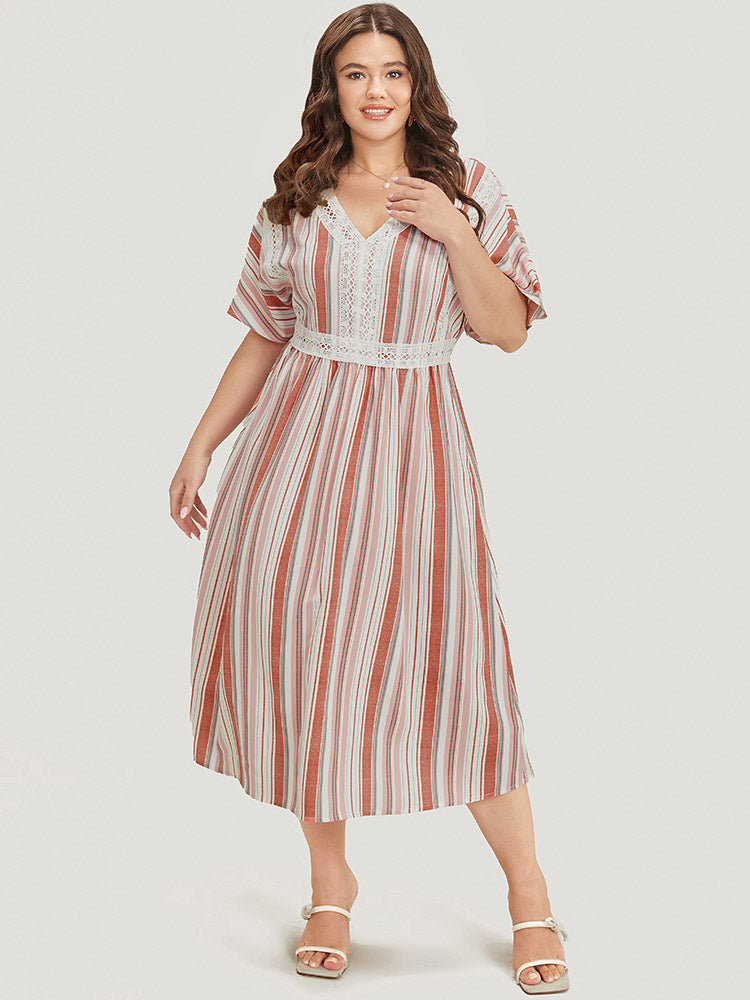 Striped Contrast Pocket Lace Batwing Sleeve Midi Dress