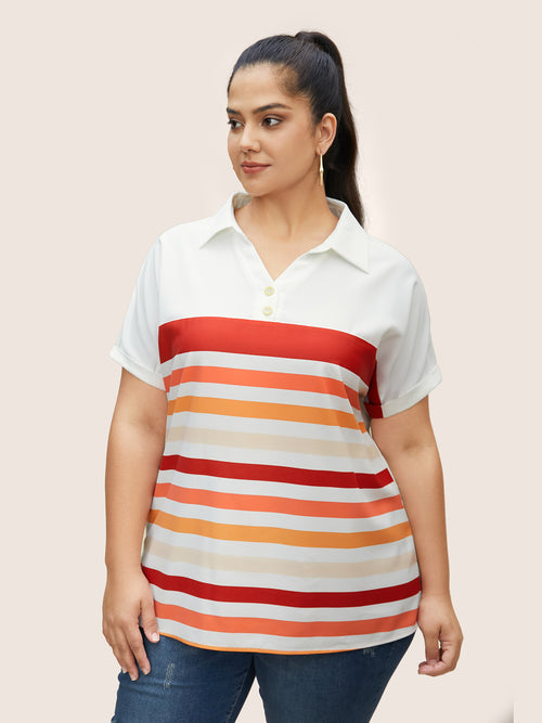 Striped Contrast Shirt Collar Batwing Sleeve Blouse