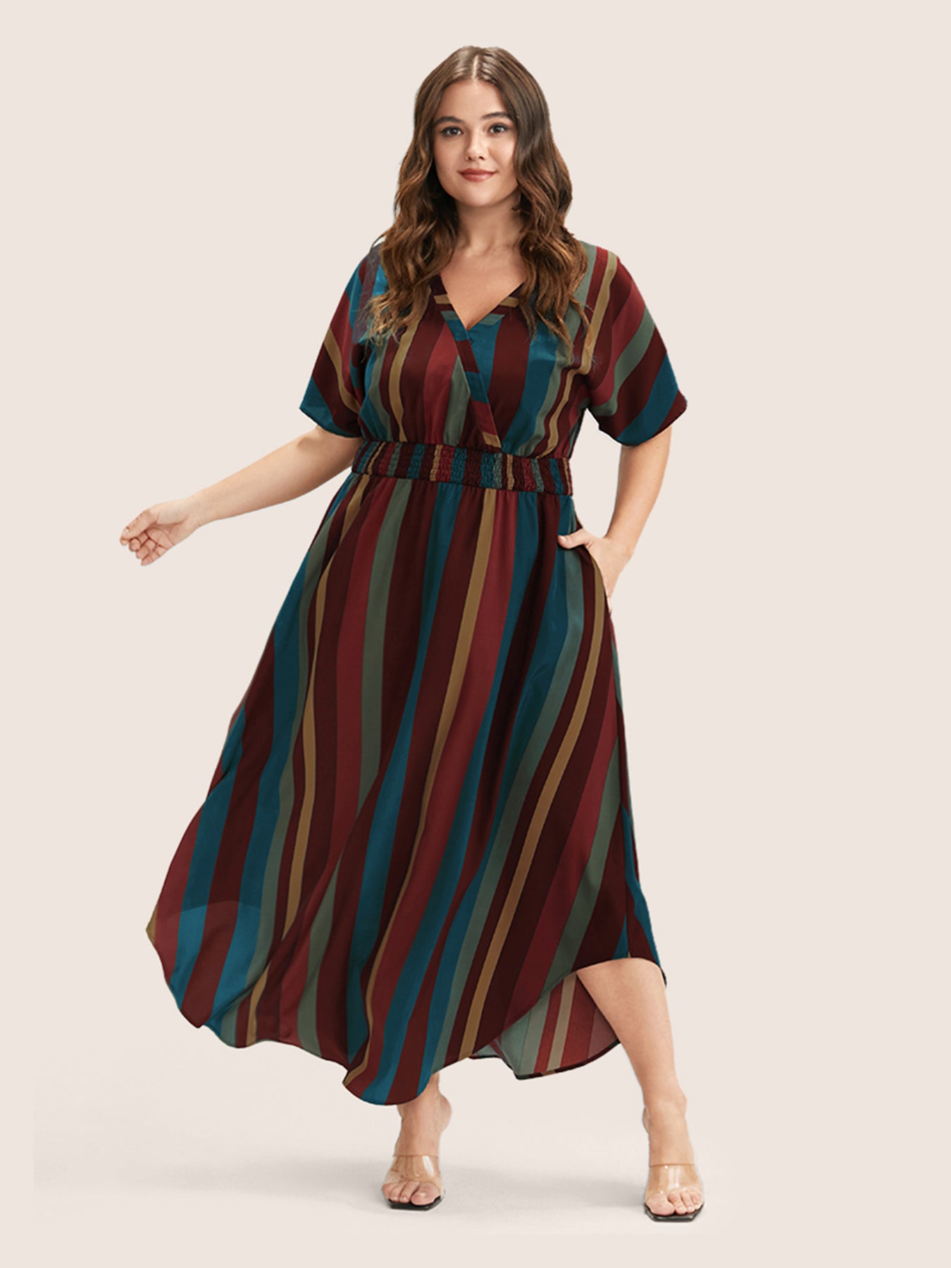 Striped Dolman Sleeve Pocket Shirred Flutter Wrap Dress