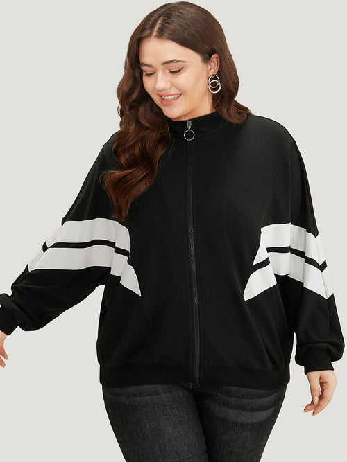 Striped Geometric Mock Neck Zipper Jacket