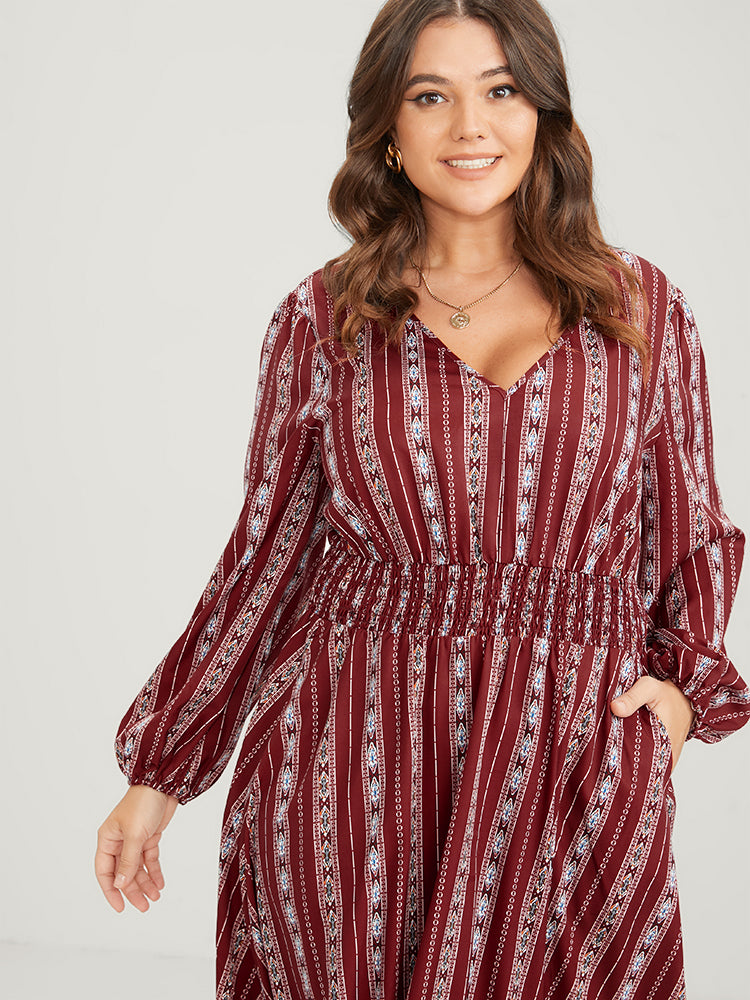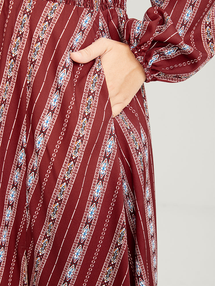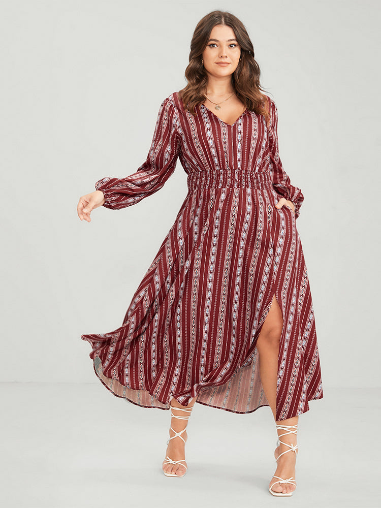 Striped Geometric Pocket Lantern Sleeve Shirred Split Dress