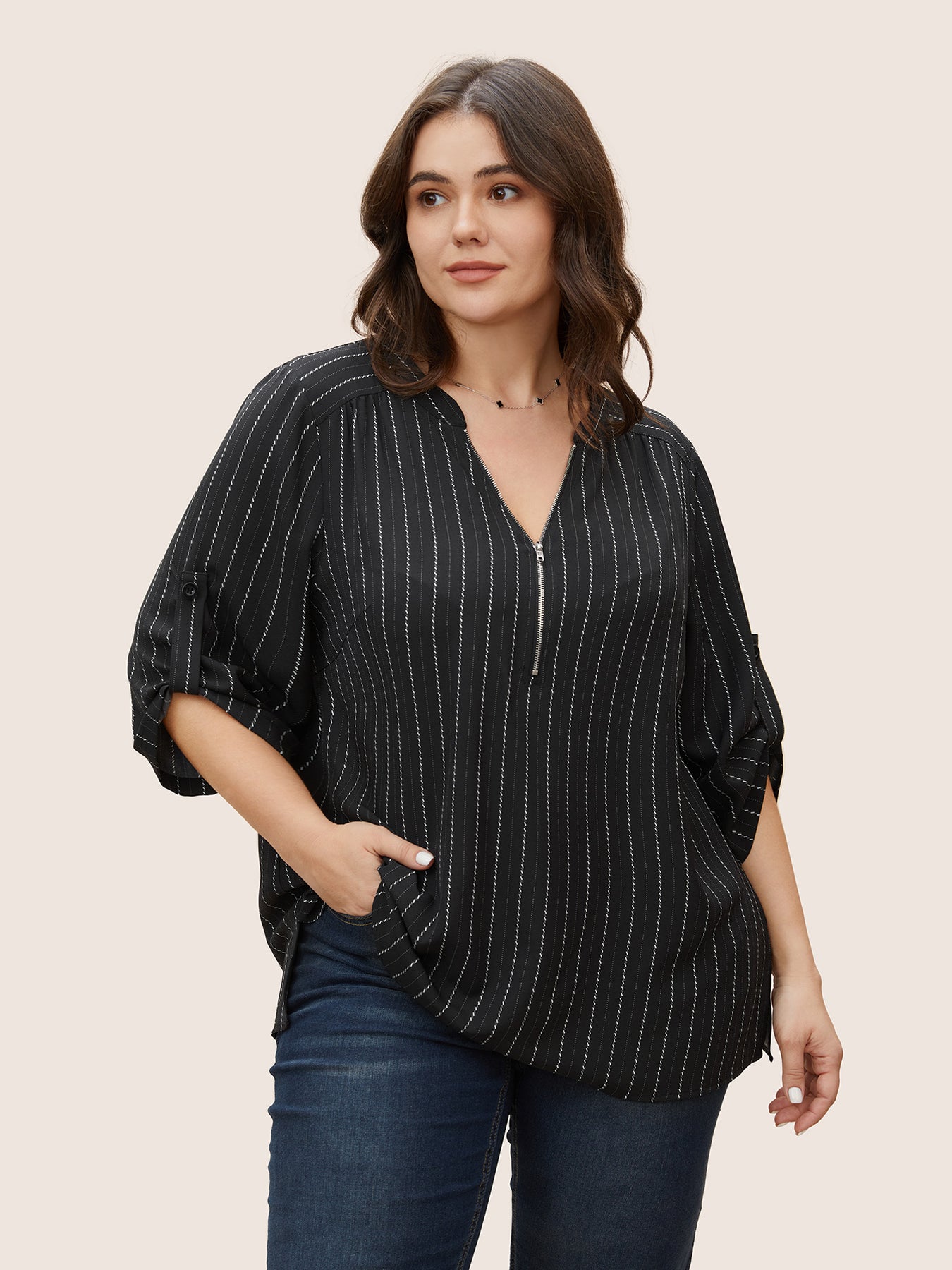 Striped Half Zip Tab Sleeve Blouse