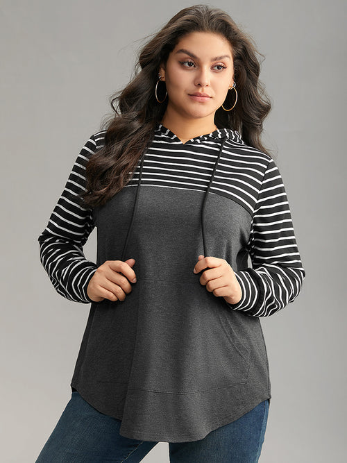 Striped Patchwork Hooded Pocket Drawstring Sweatshirt