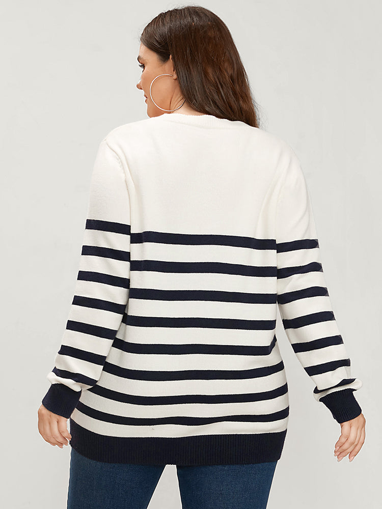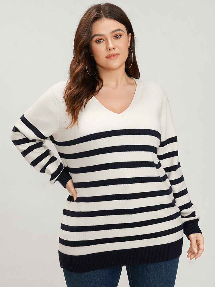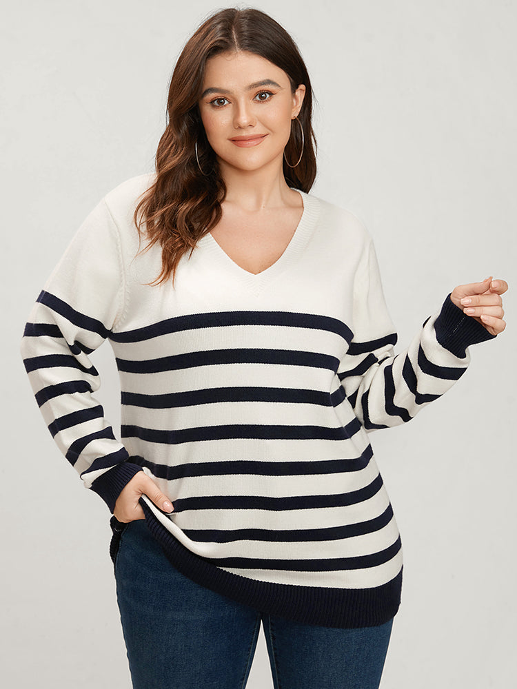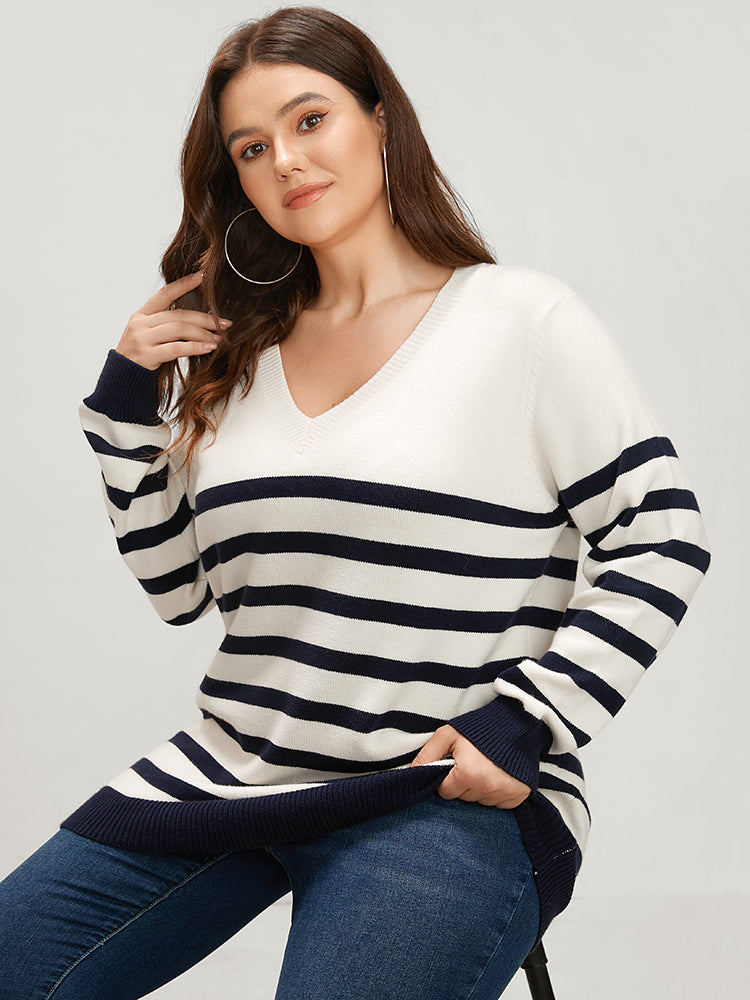 Striped Pointelle Knit V Neck Contrast Loose Knit Top