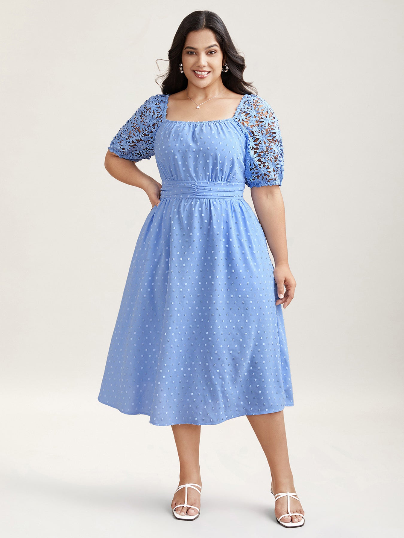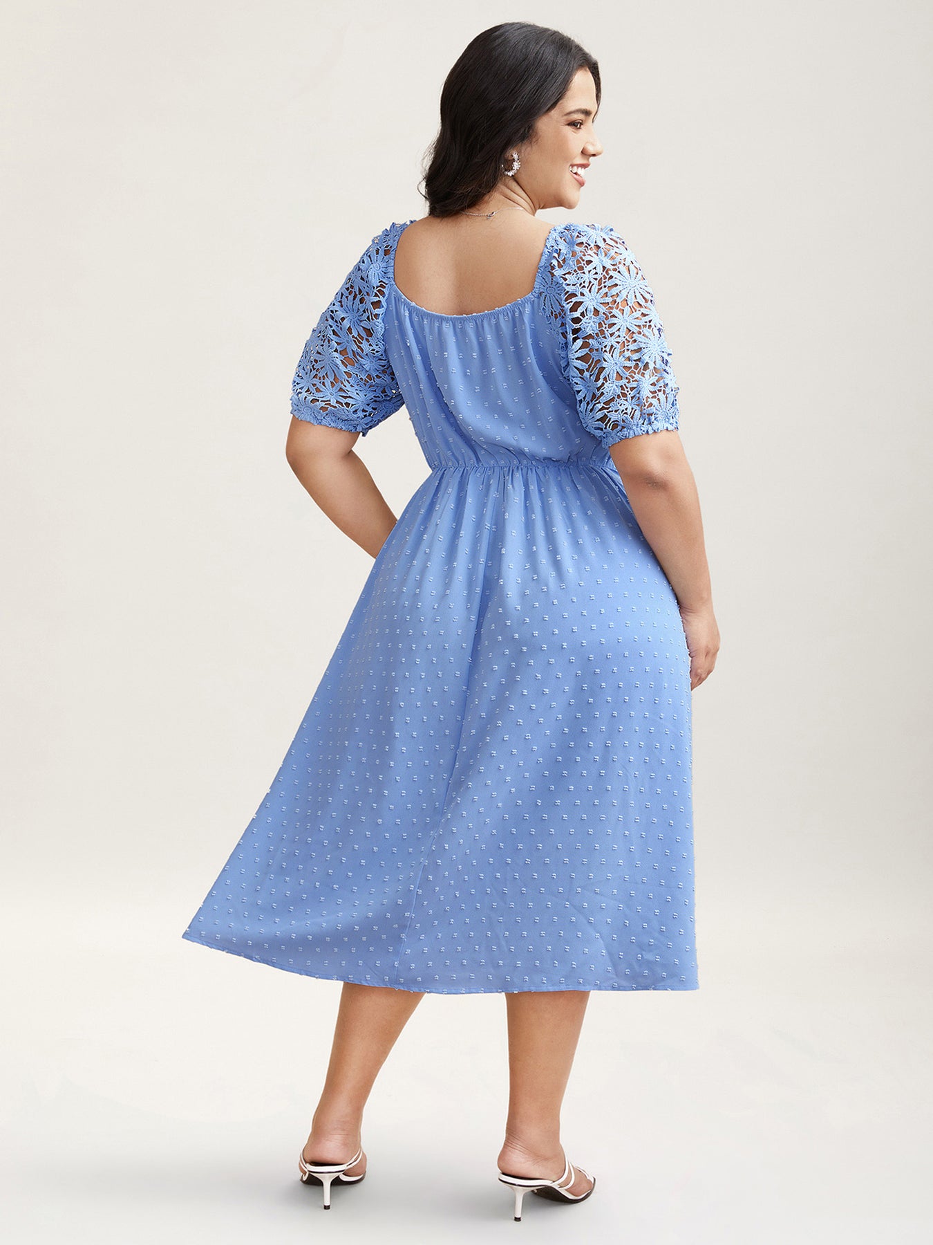 Textured Lace Sleeve Stretchy Waist Midi Dress