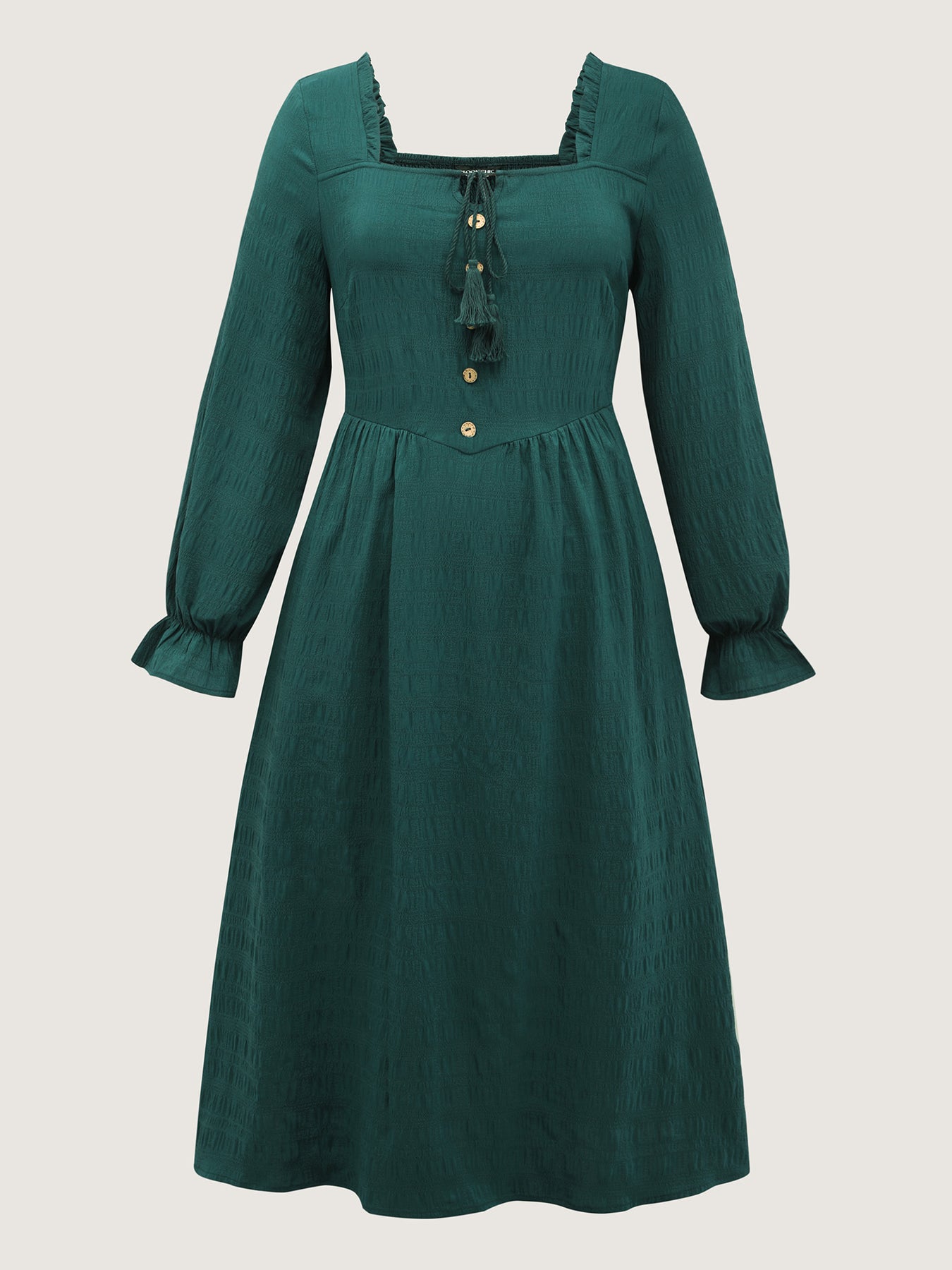 Textured Ruffled Neck Shirred Drawstring Midi Dress