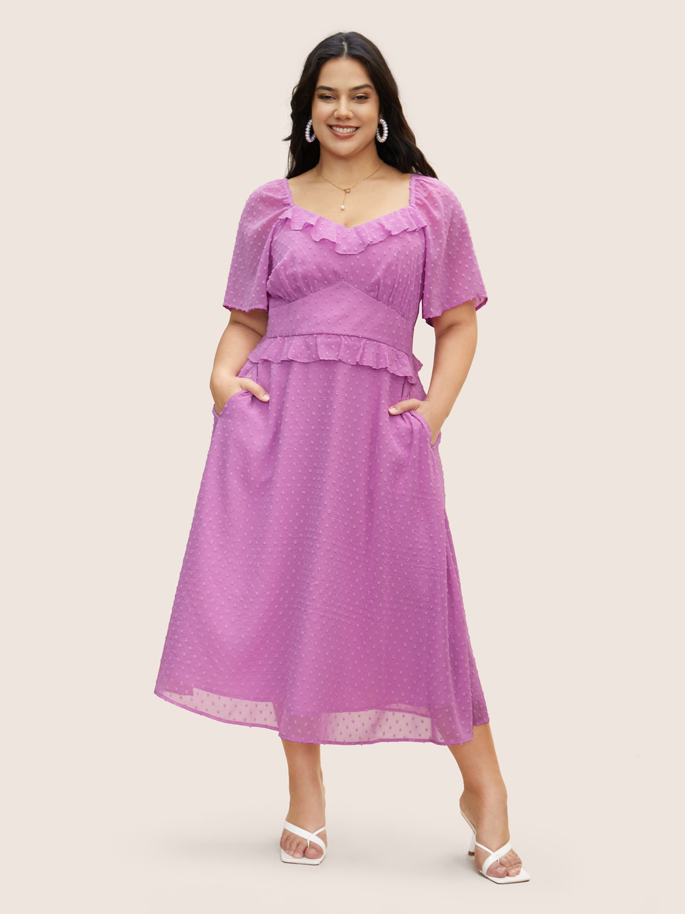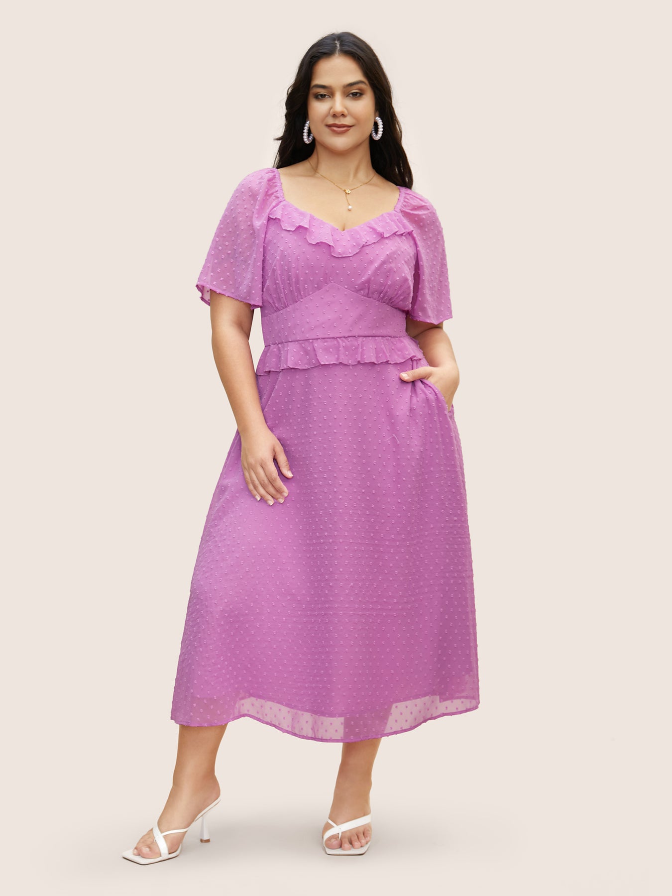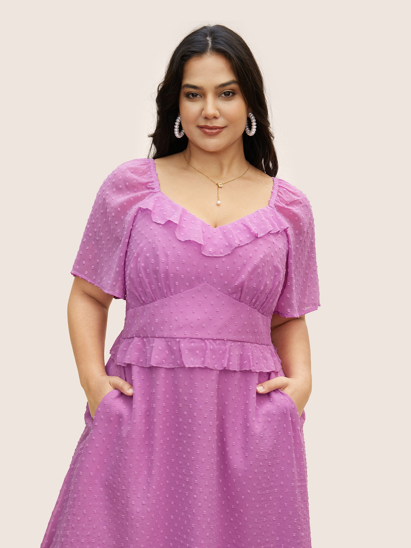Textured Ruffles Shirred Raglan Sleeve Dress