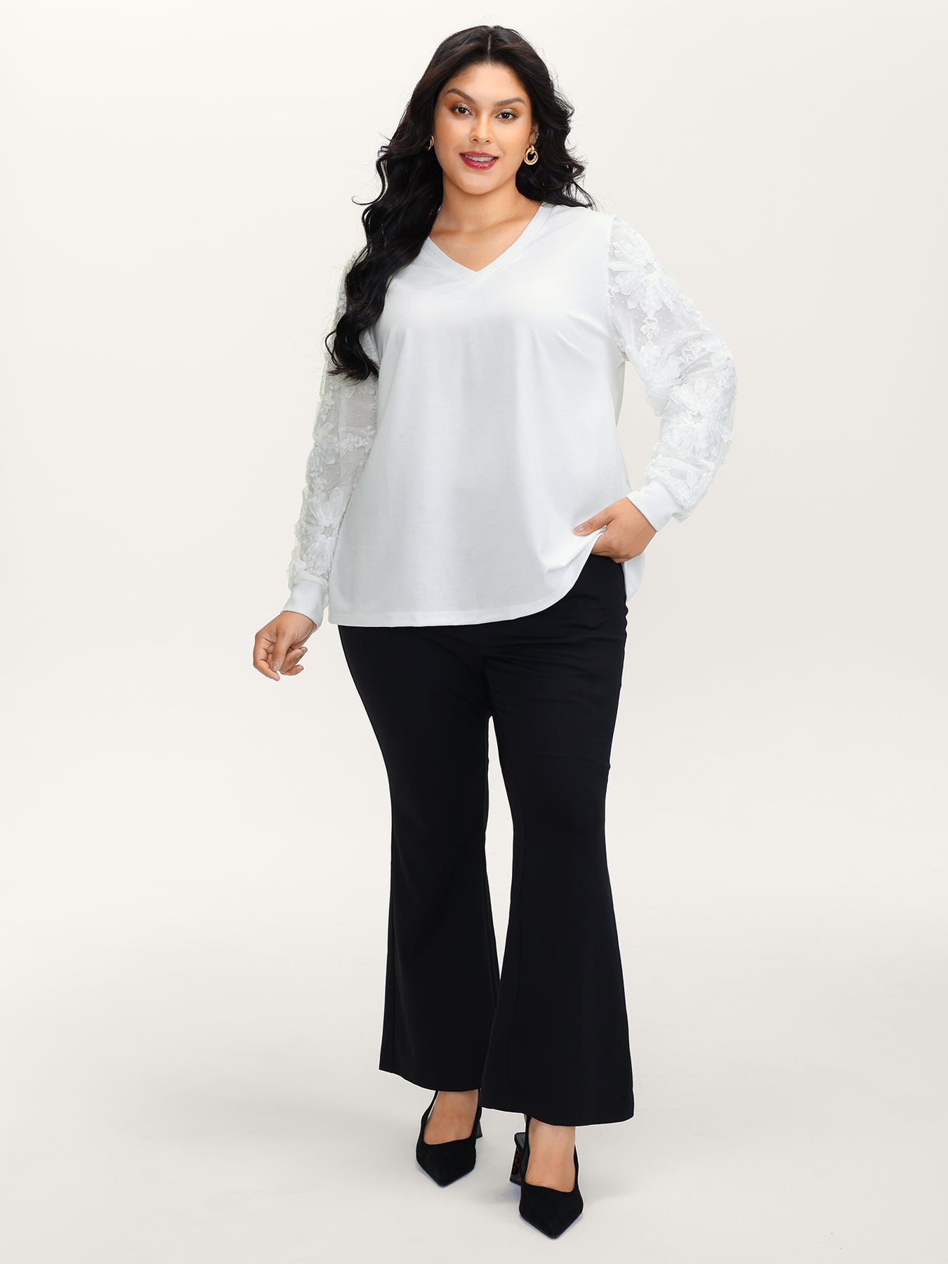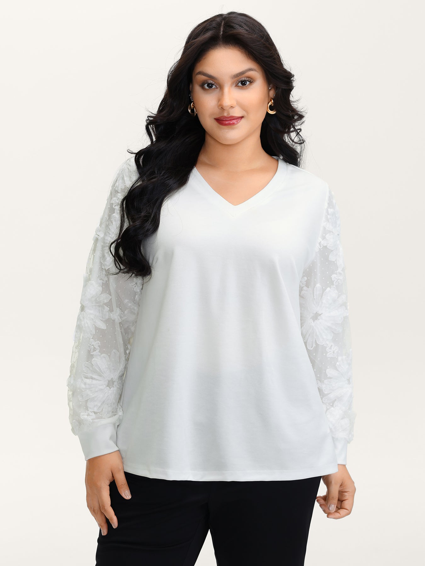 Textured Sheer Sleeve V-Neck T-Shirt