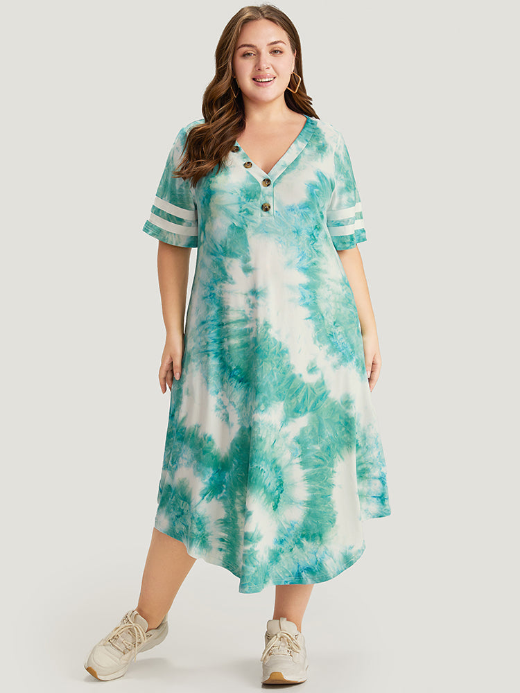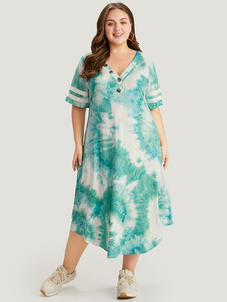 Tie Dye & Striped Button Detail Pocket Arc Hem Dress
