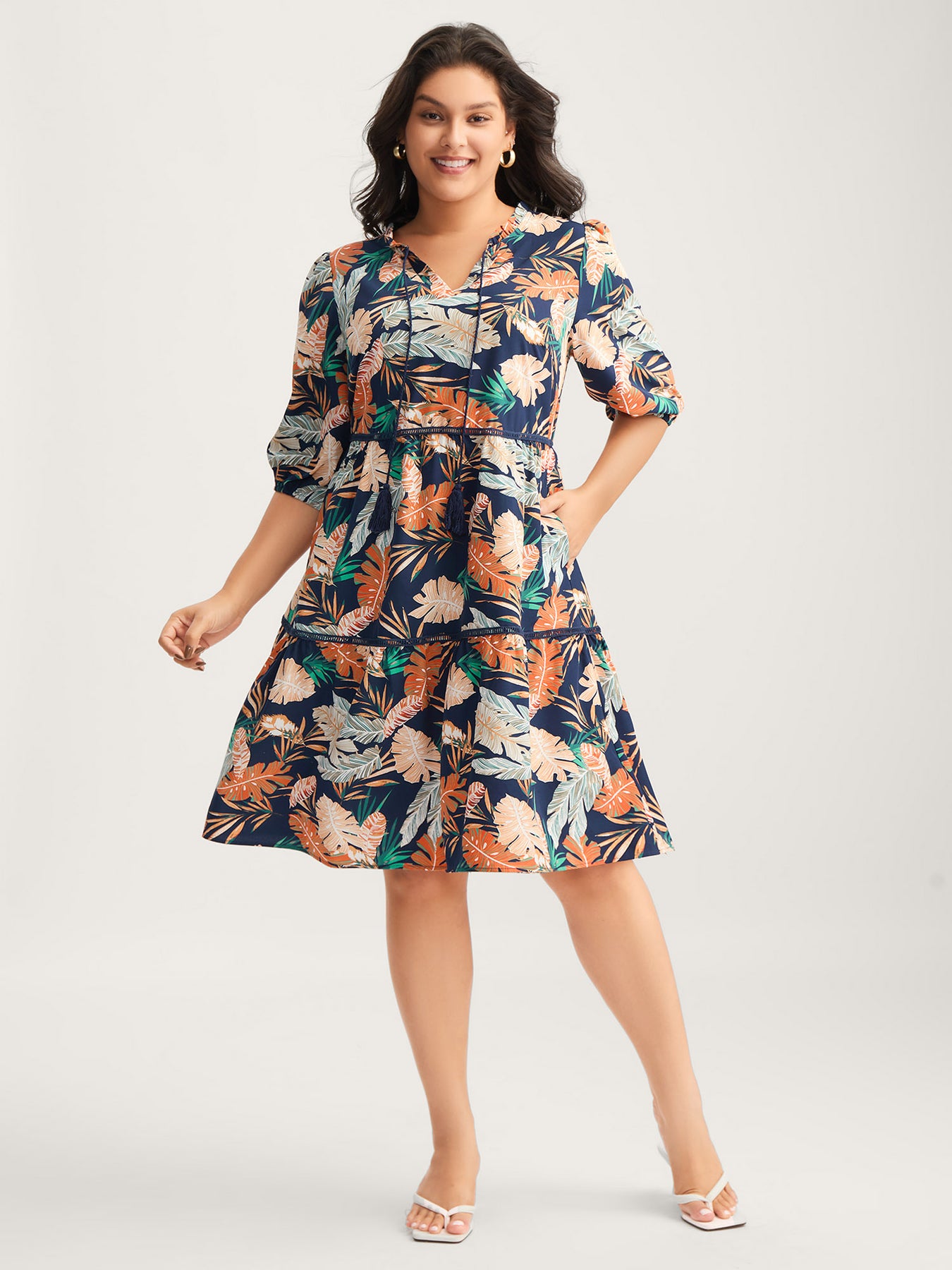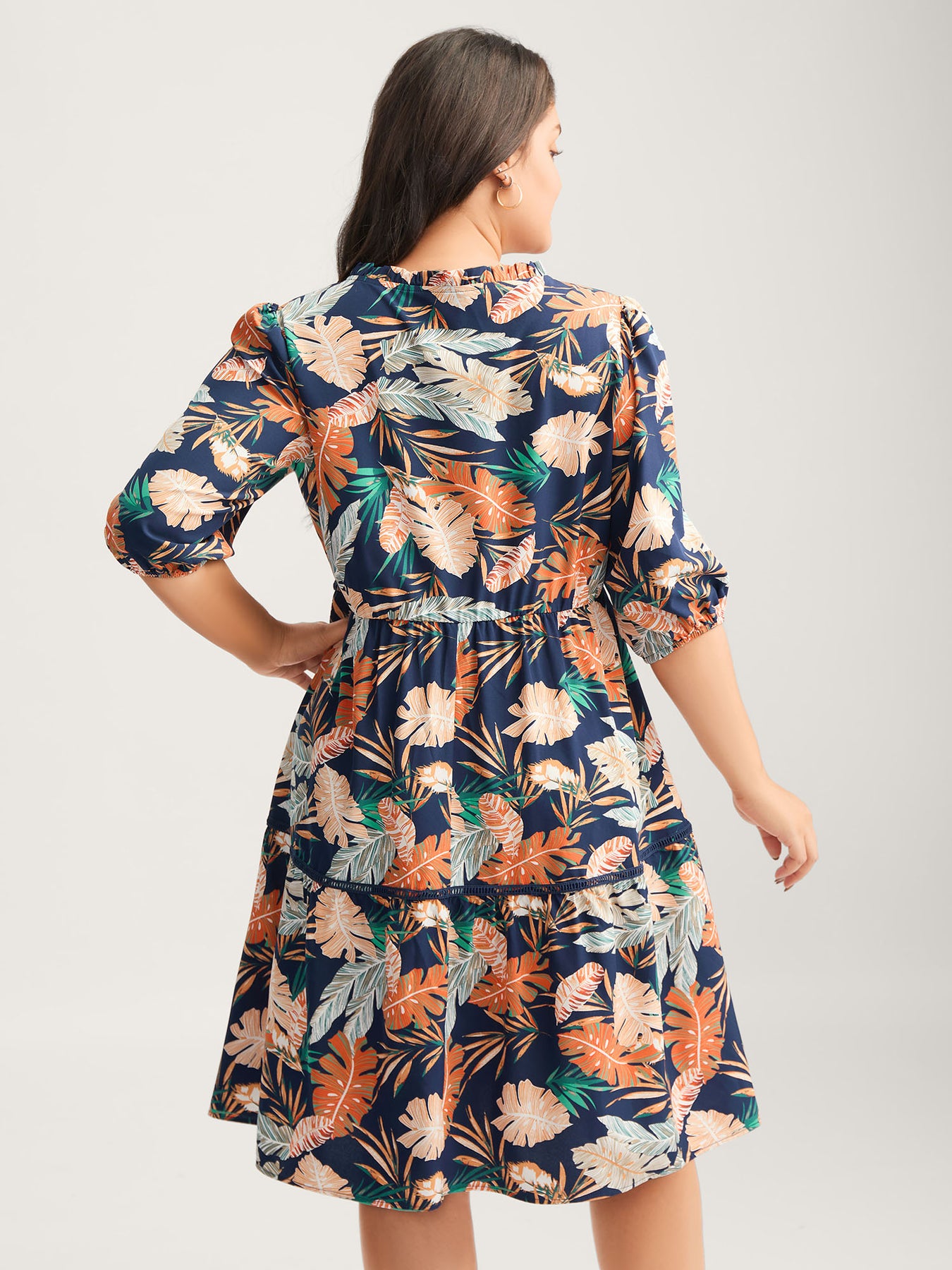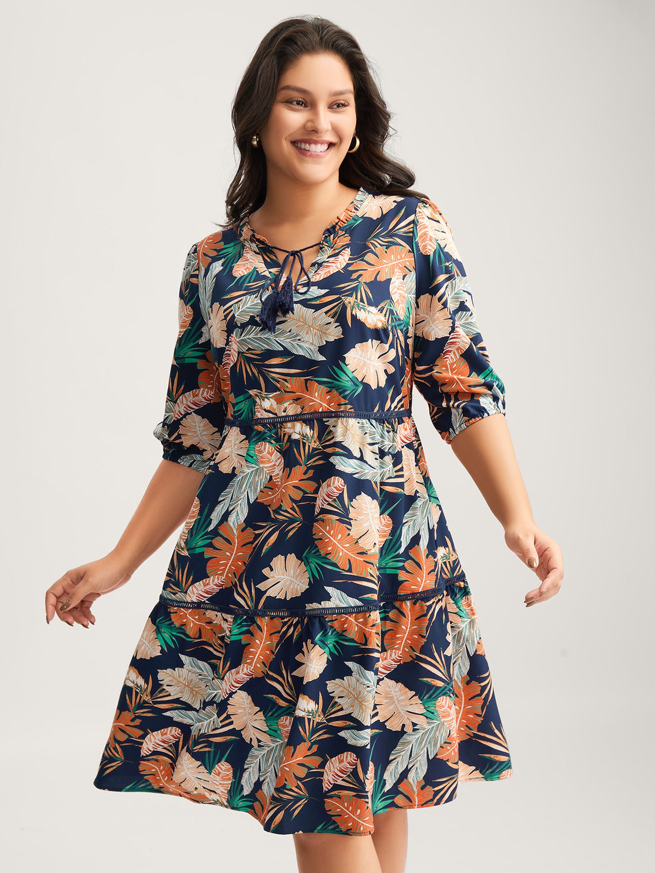 Tropical Leaf Print Lace Stretchy Midi Dress