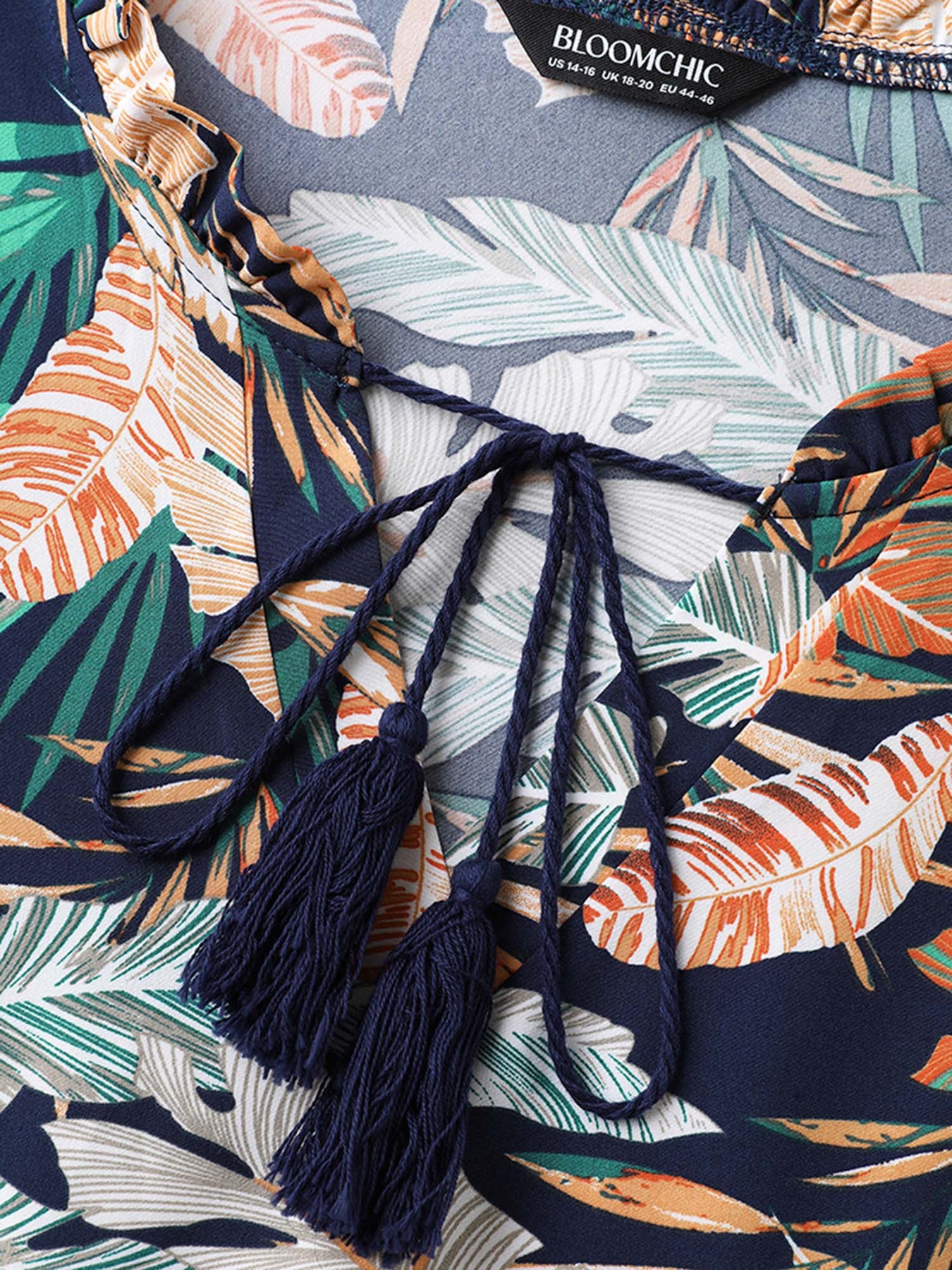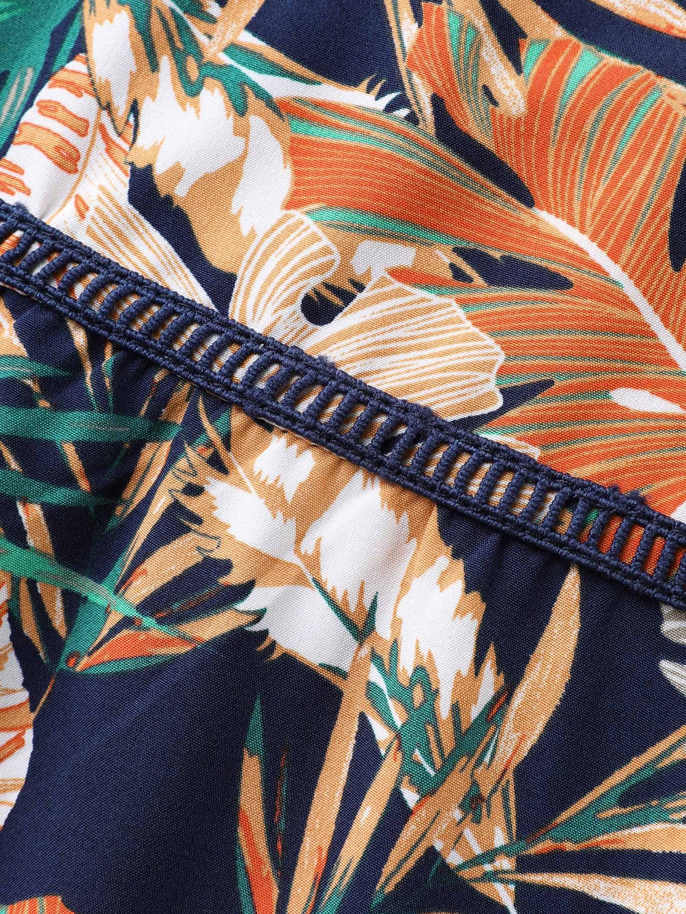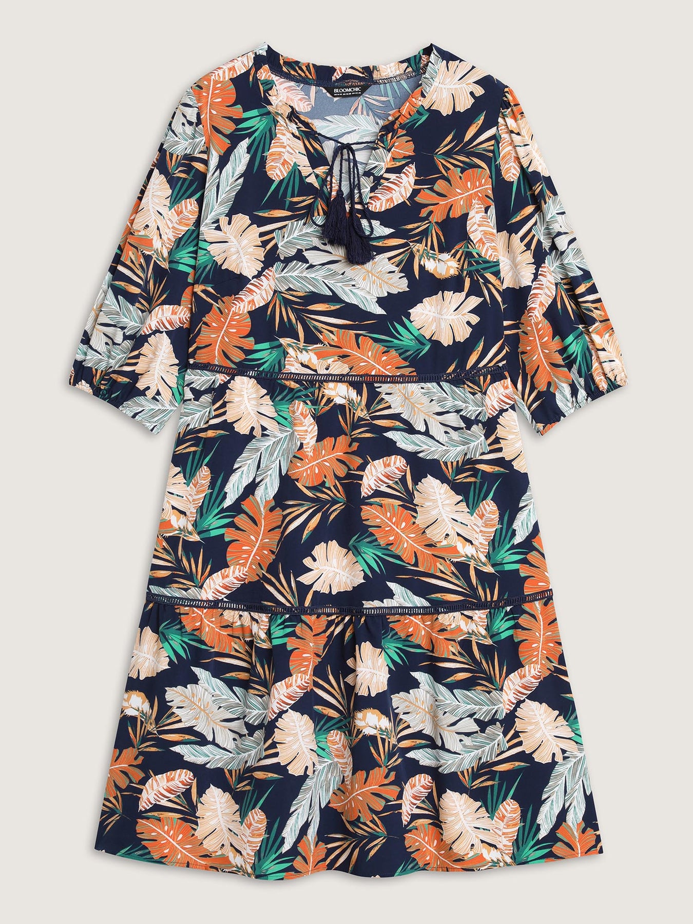Tropical Leaf Print Lace Stretchy Midi Dress