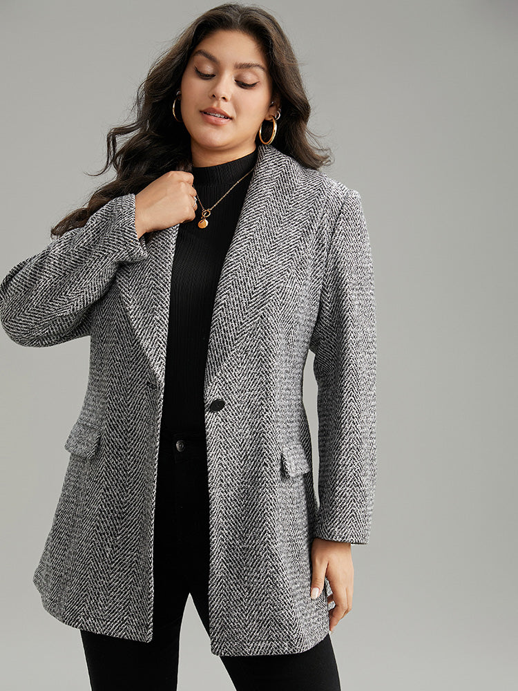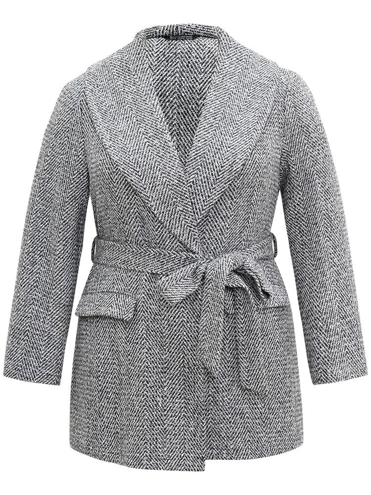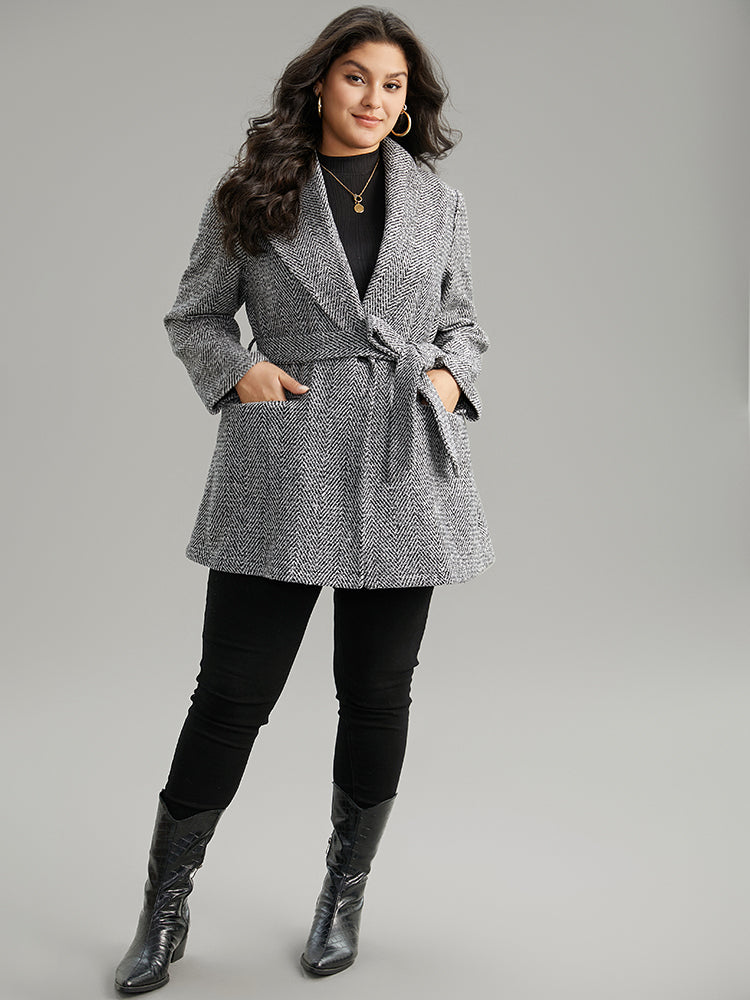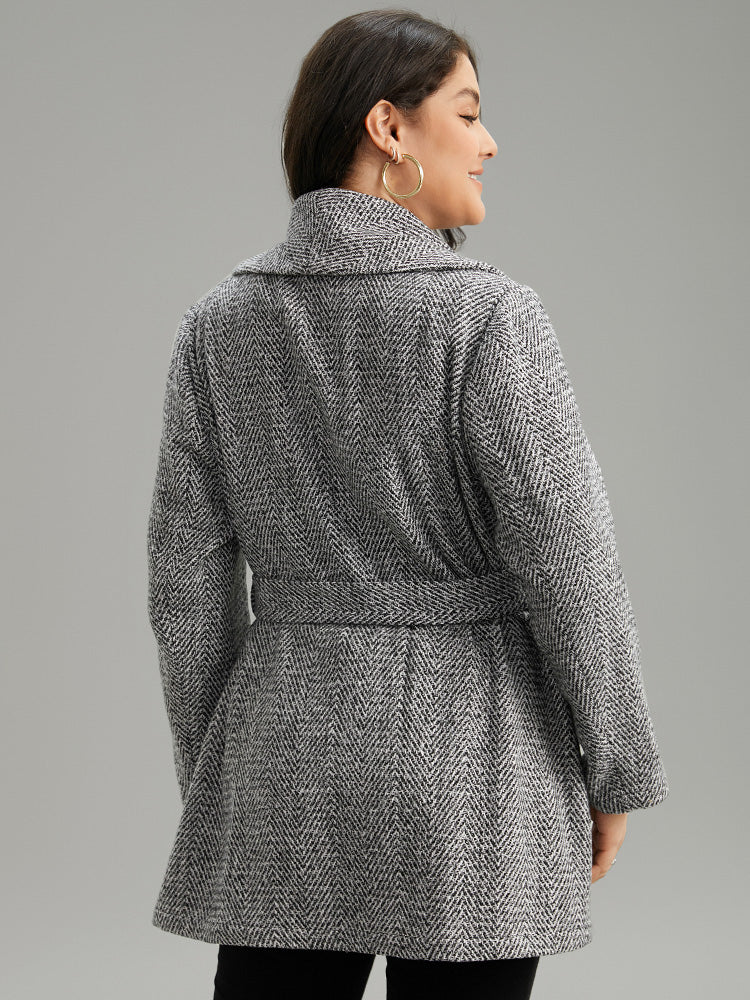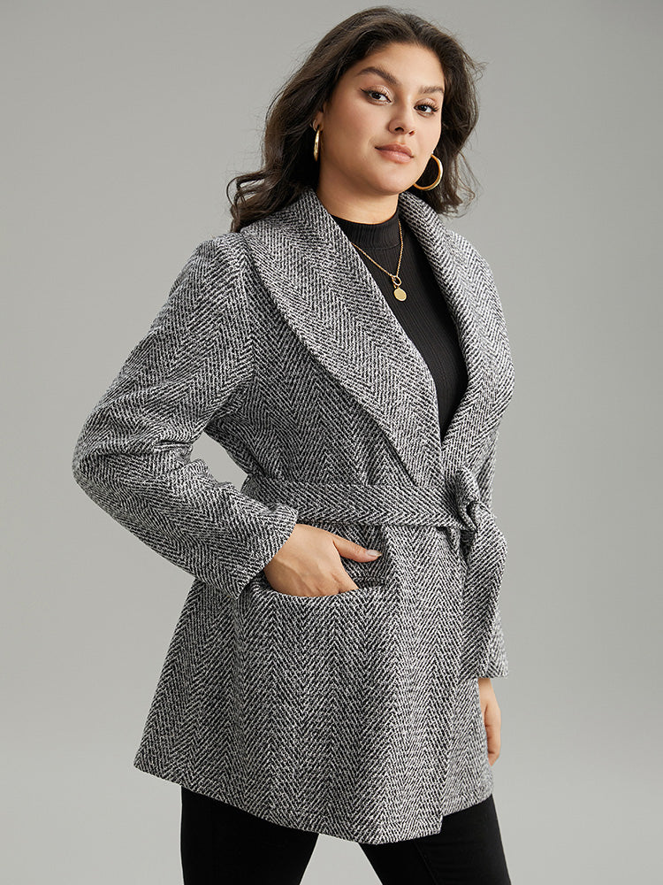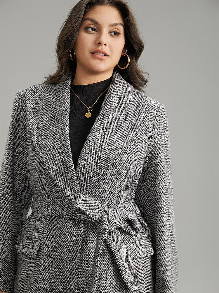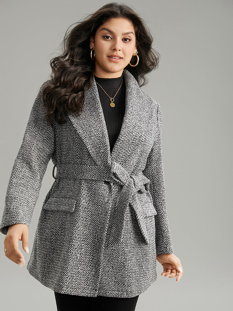 Tweed Belted Lapel Collar Flap Pocket Coat