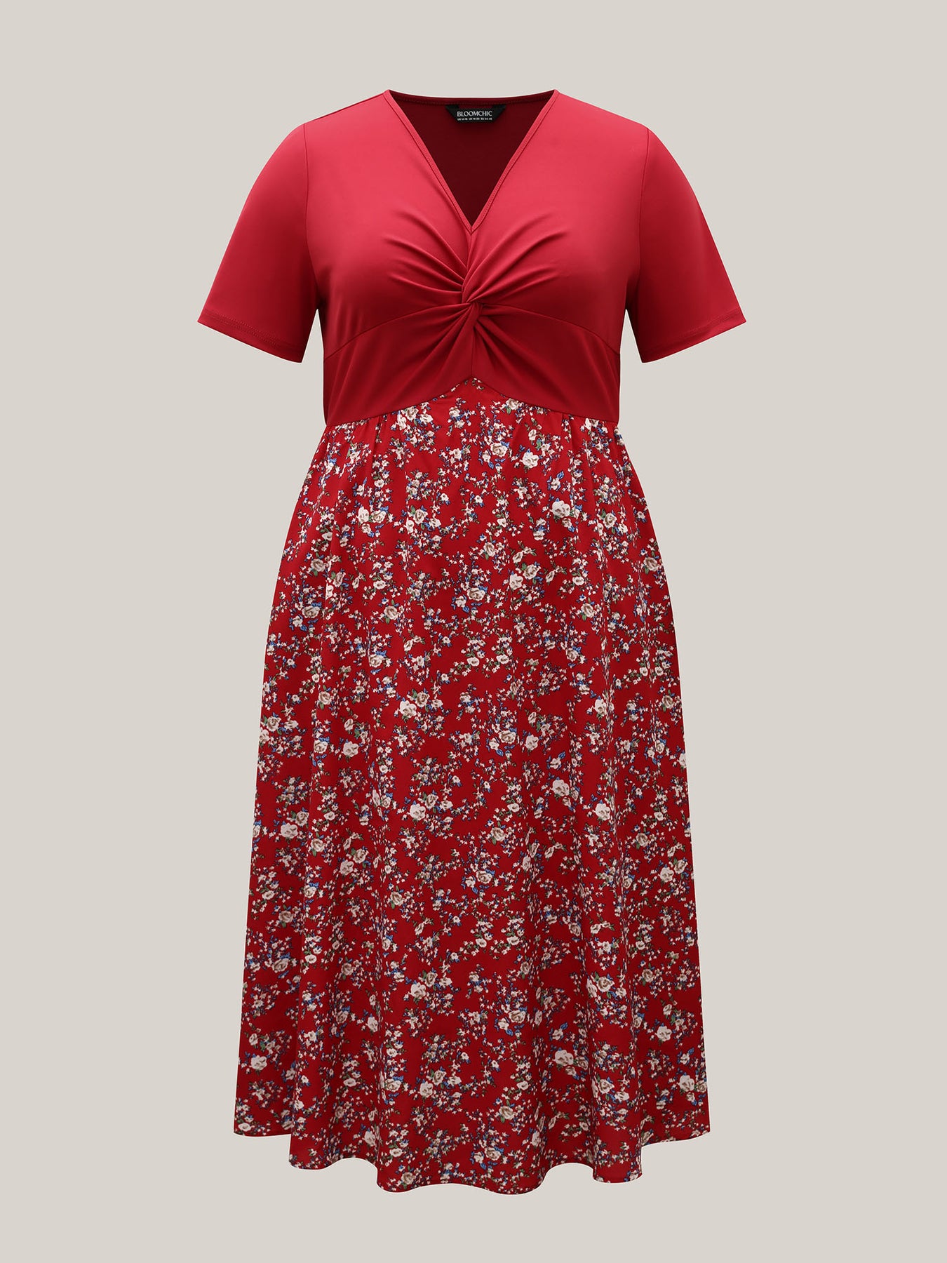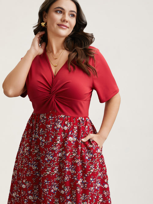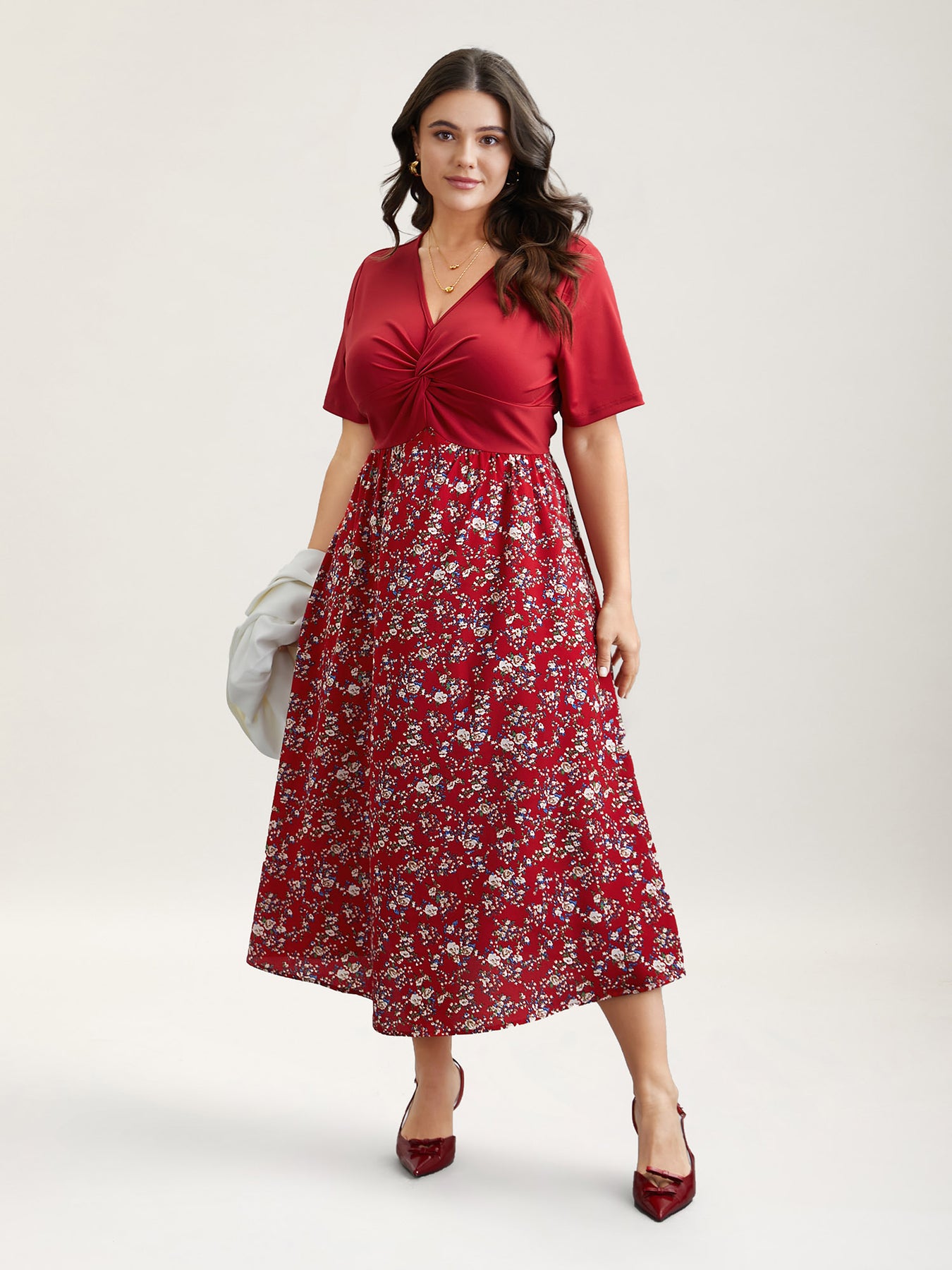 Twist-Front V-Neck Stretchy Waist Midi Dress