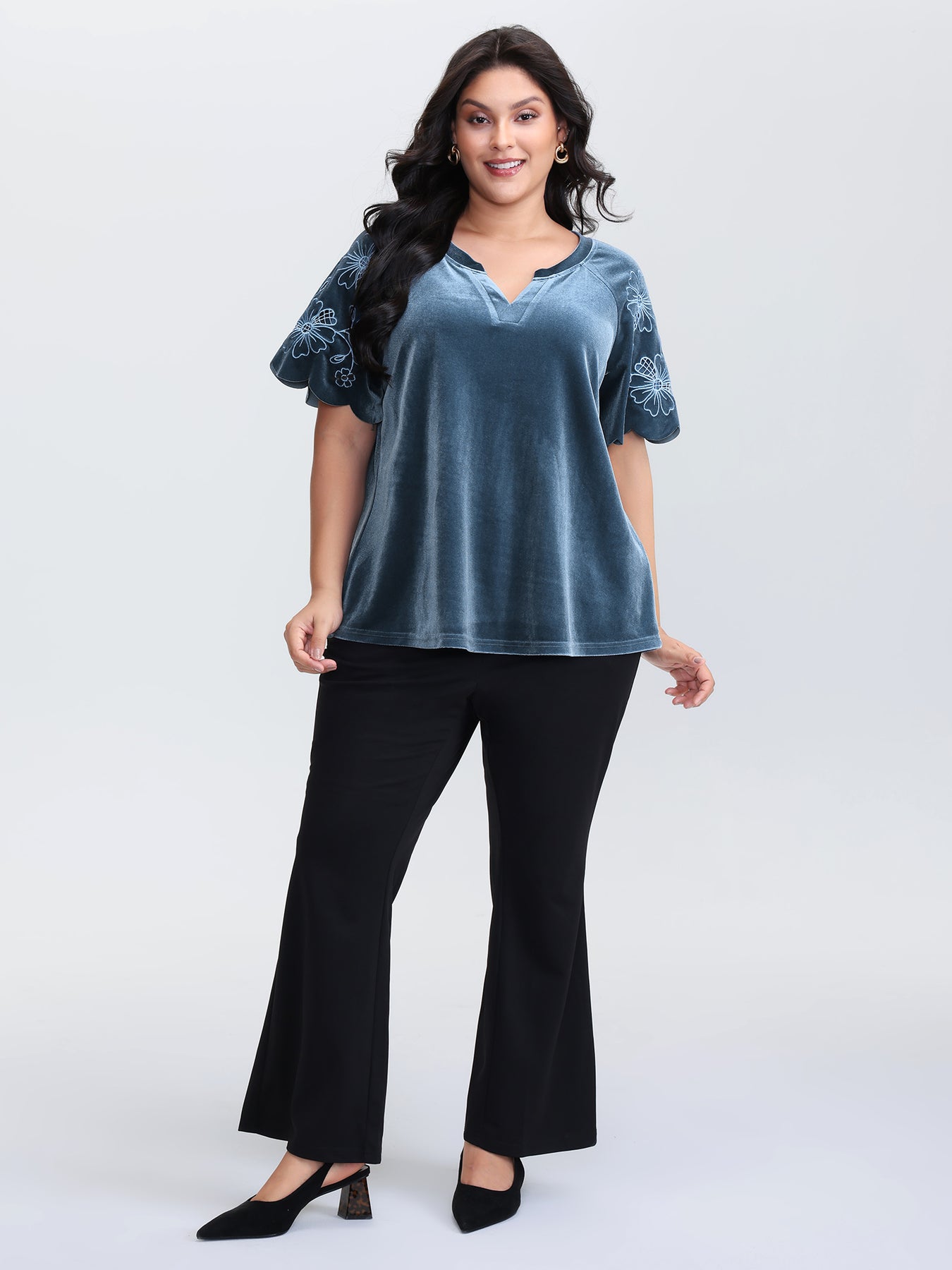 Velvet Embroidered Mesh Sleeve Stretchy Blouse