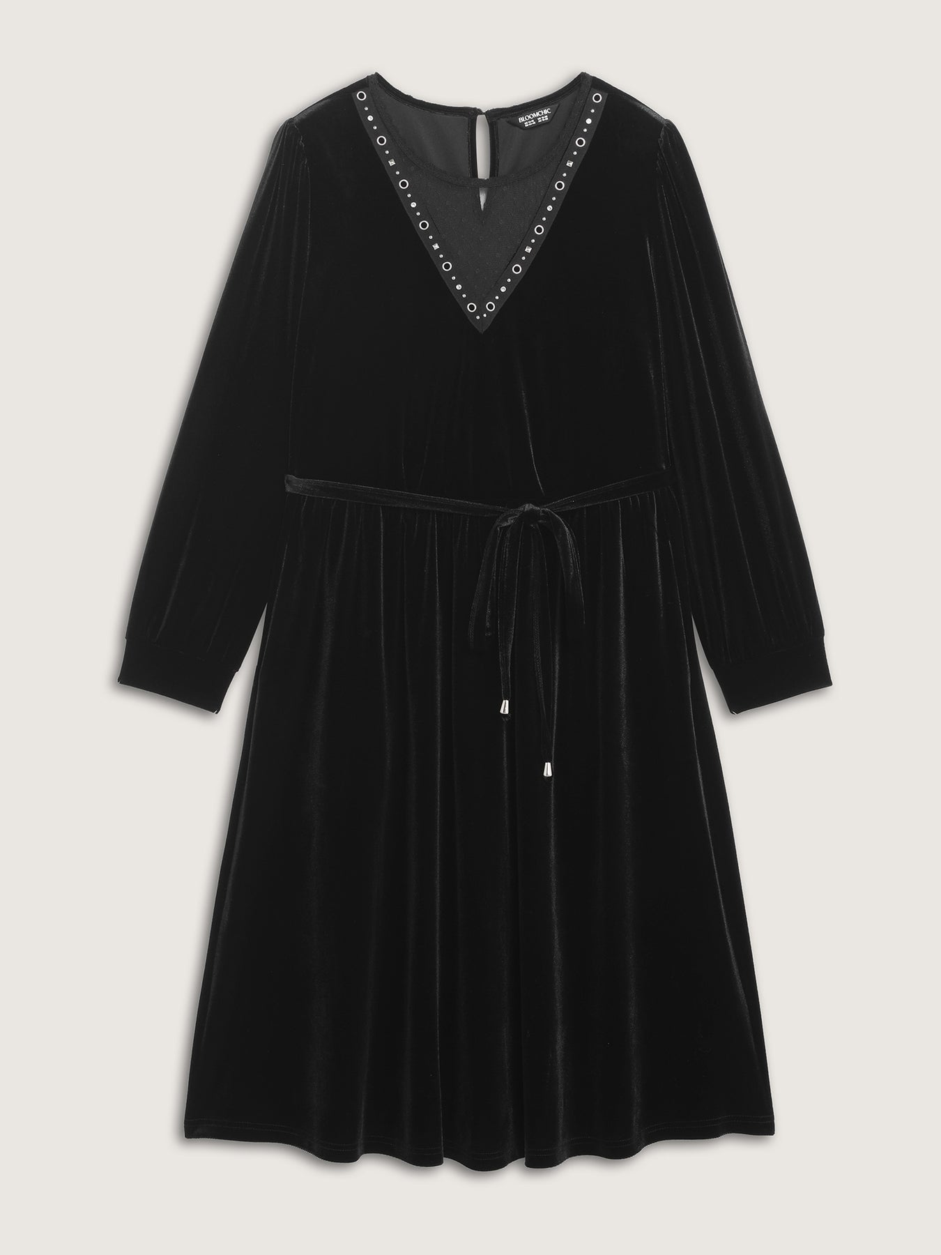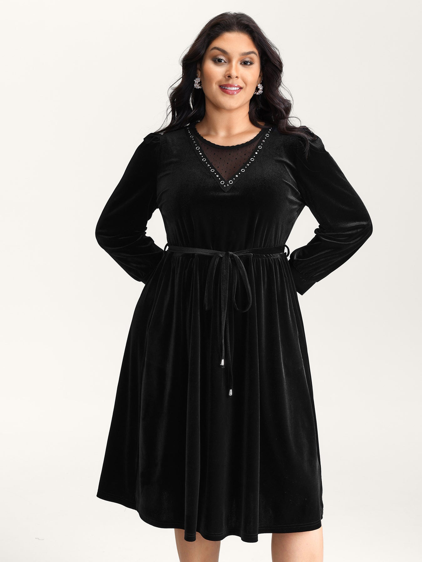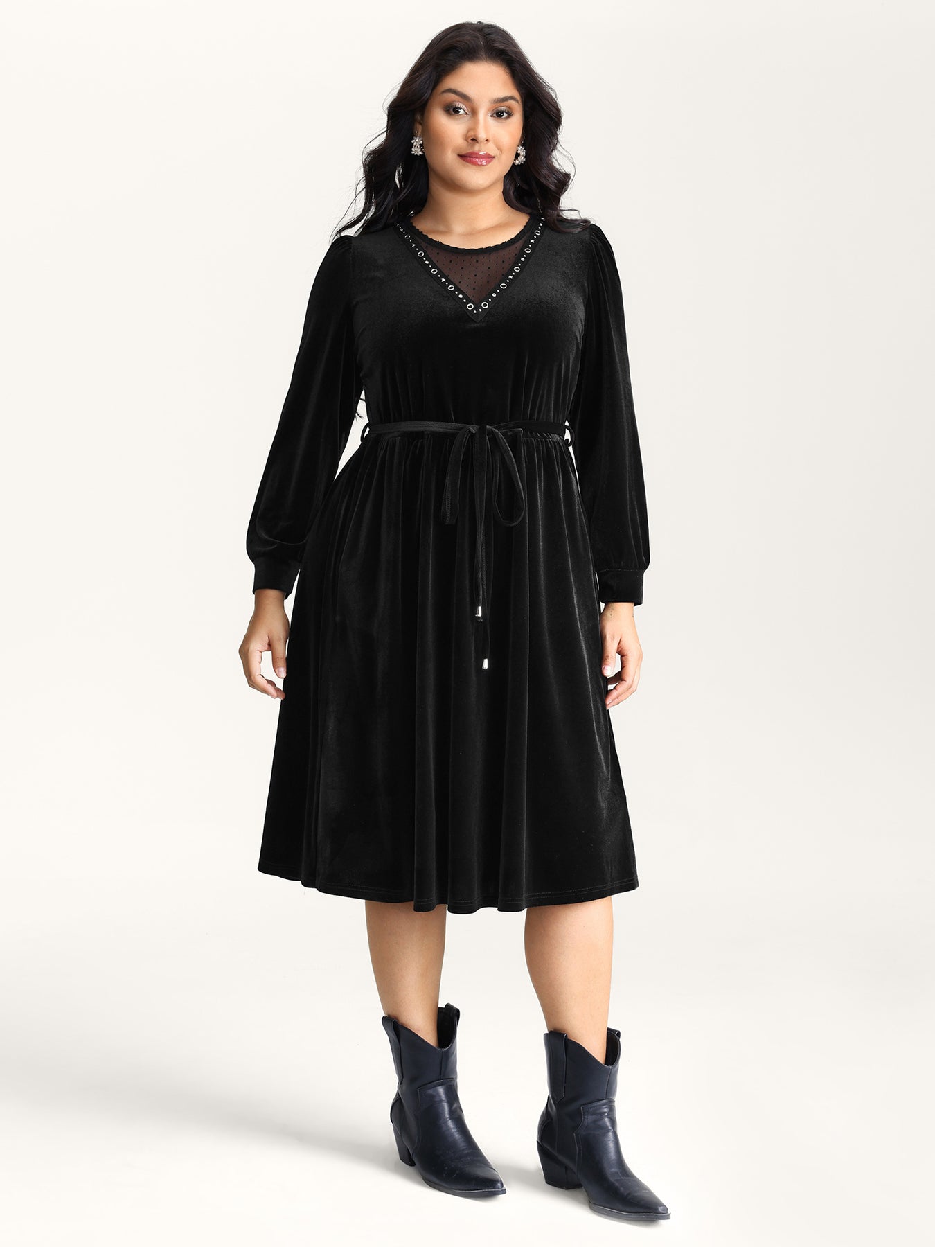 Velvet Sheer Neckline Belted Waist Maxi Dress
