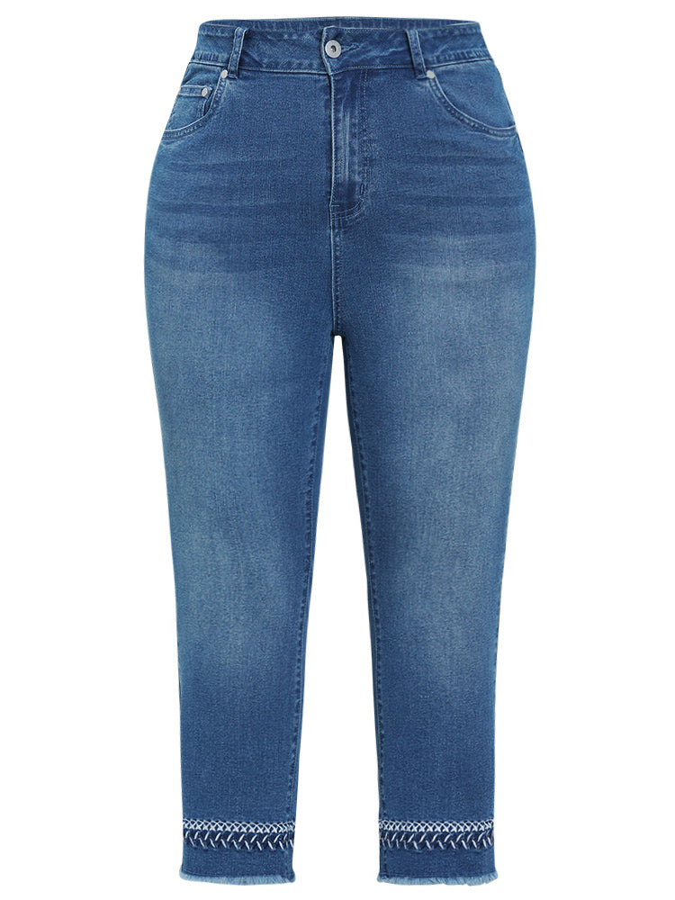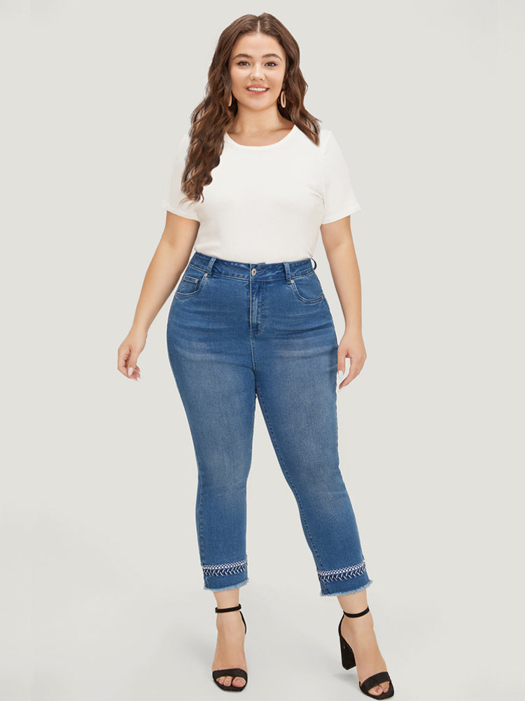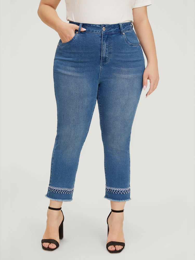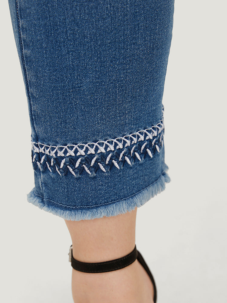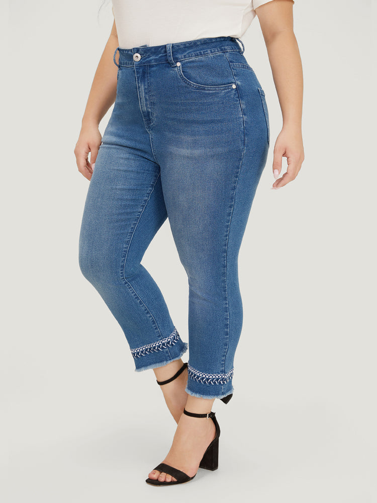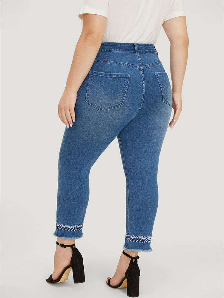 Very Stretchy Medium Wash Embroidered Raw Hem Jeans