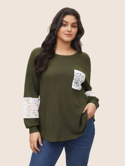 Waffle Knit Contrast Lace Patchwork T-shirt