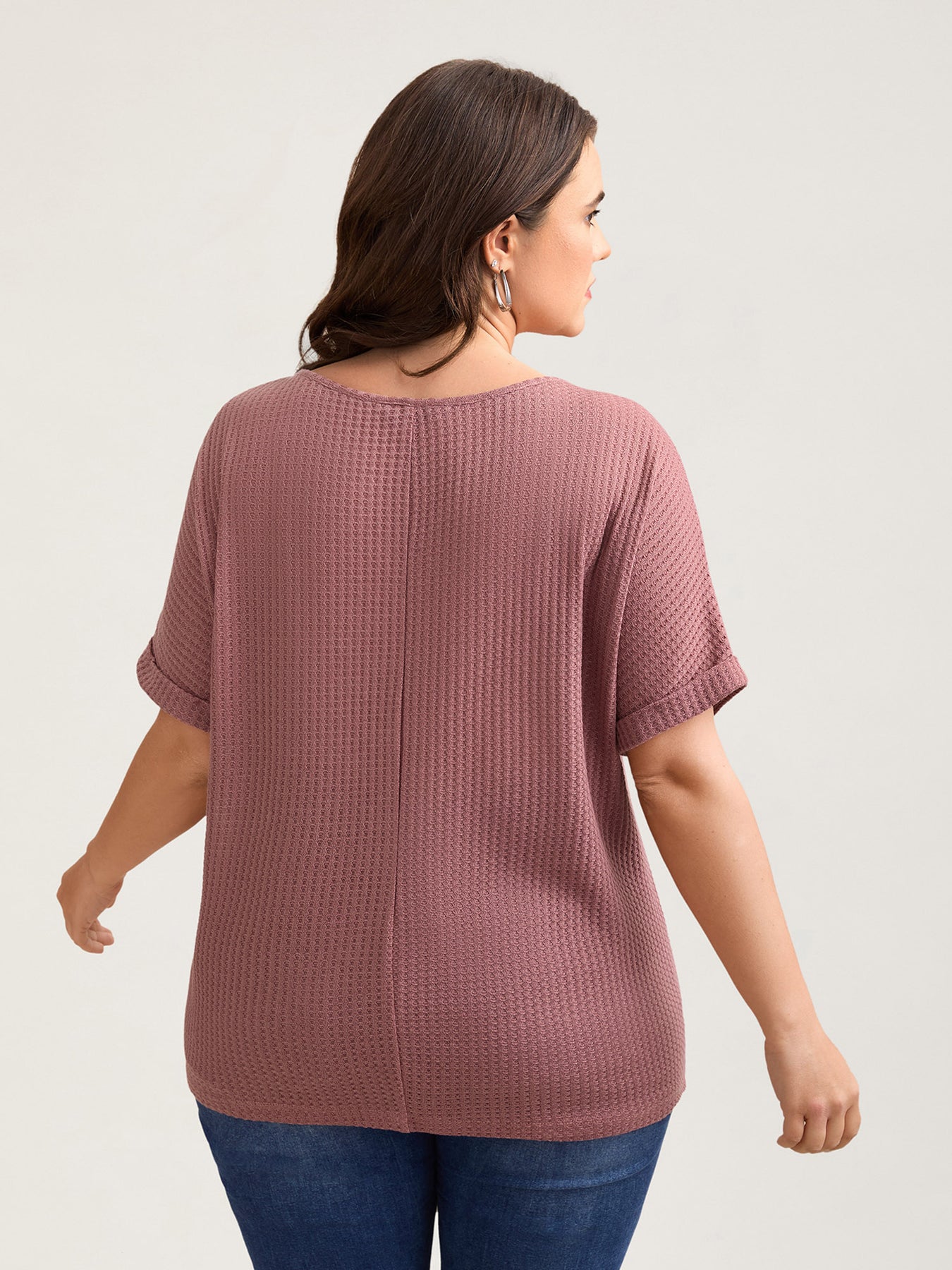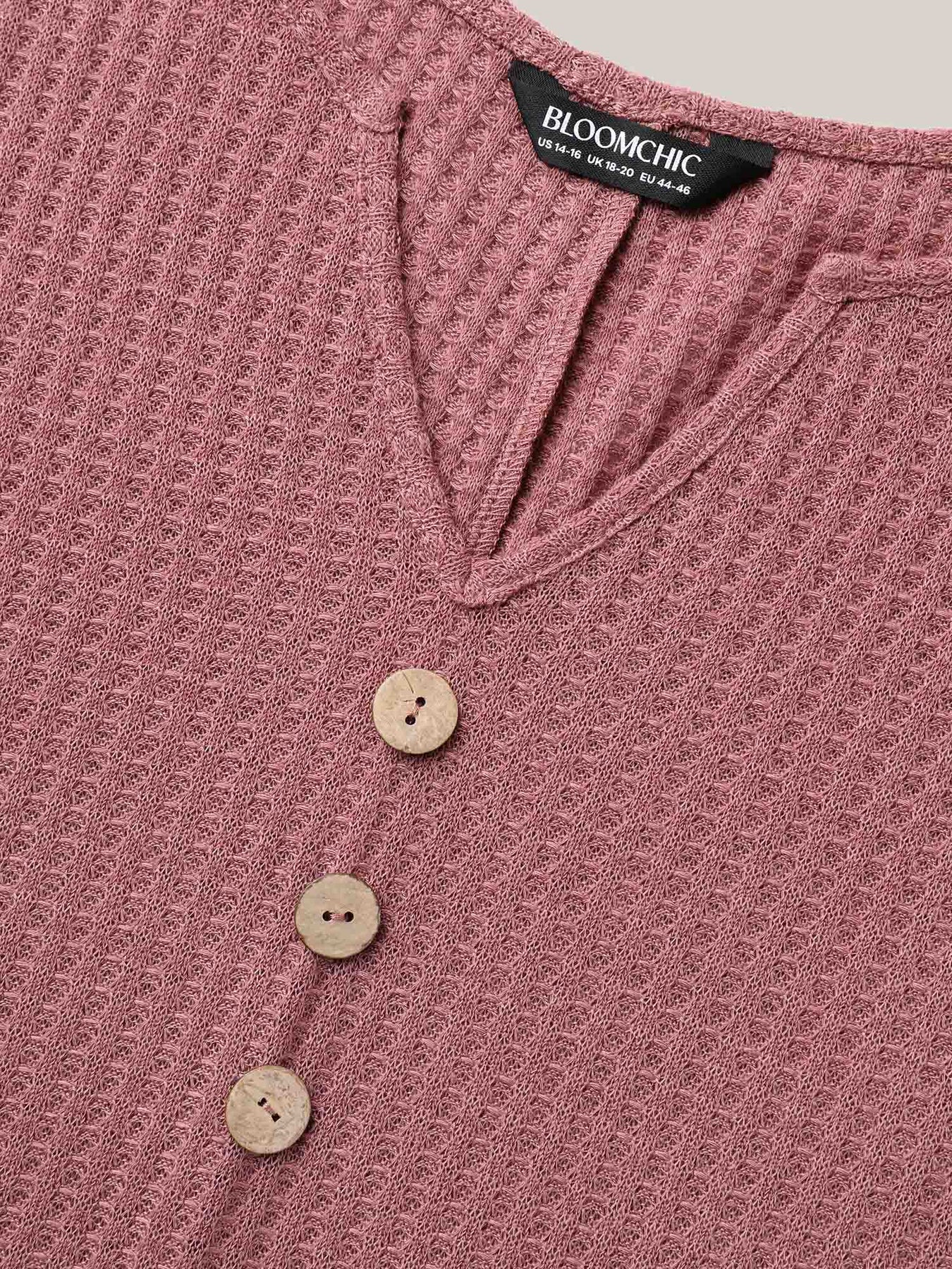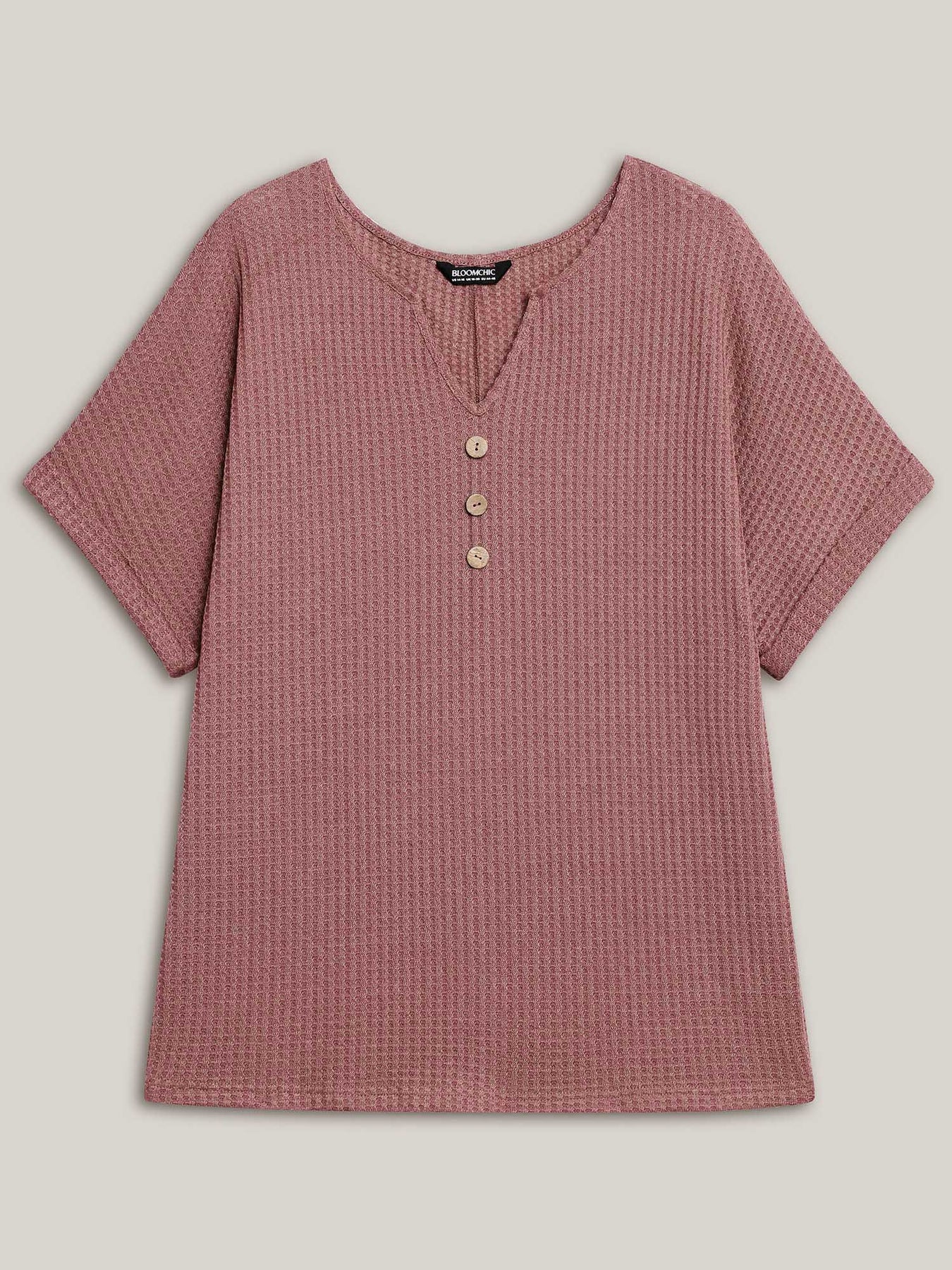 Waffle Knit Stretchy Button Split Neck T-Shirt
