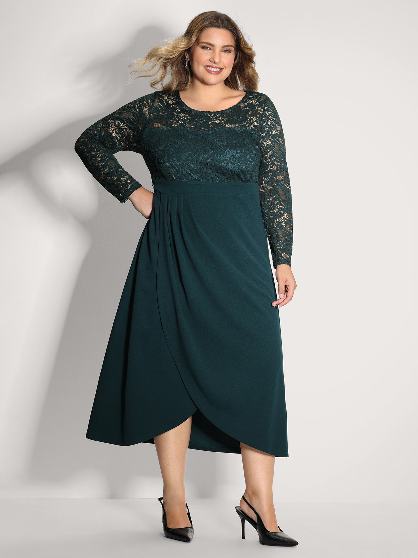 Wrap Hem Lace Sleeve Midi Dress